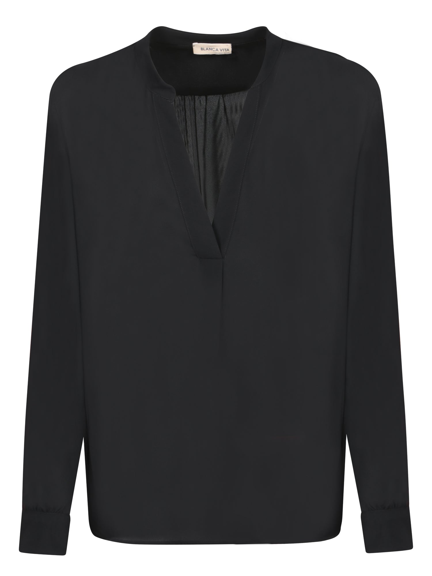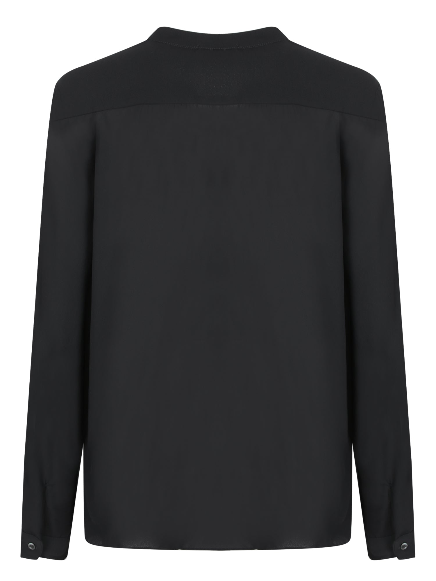 Black georgette tunic with a V-neckline. Long sleeves with elastic cuffs. Flowing and lightweight design.