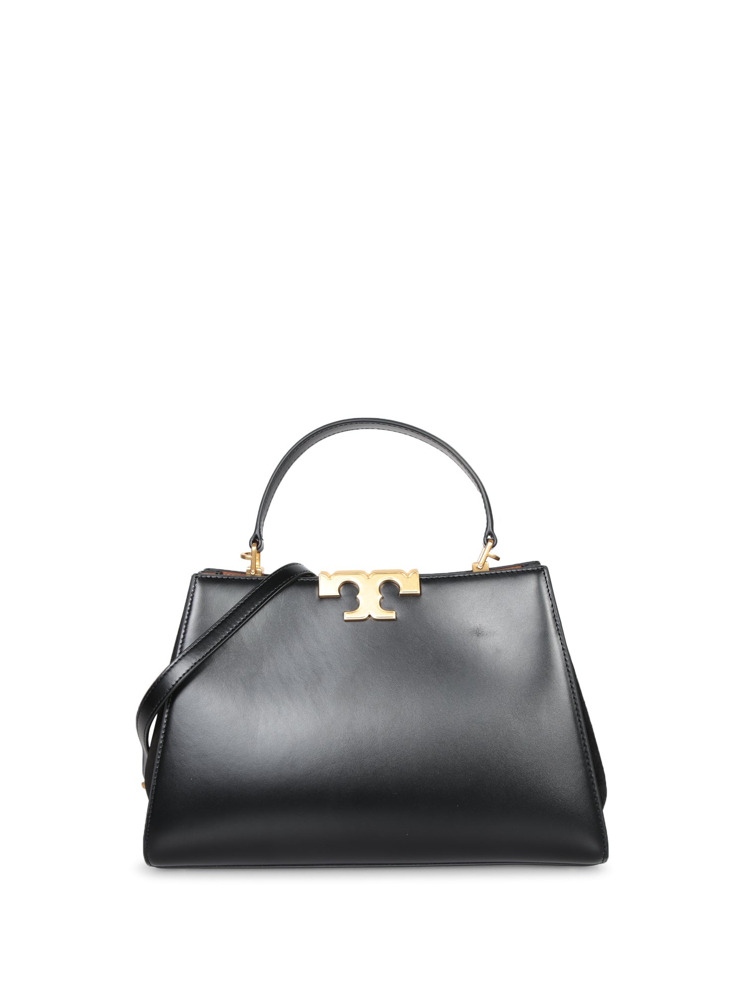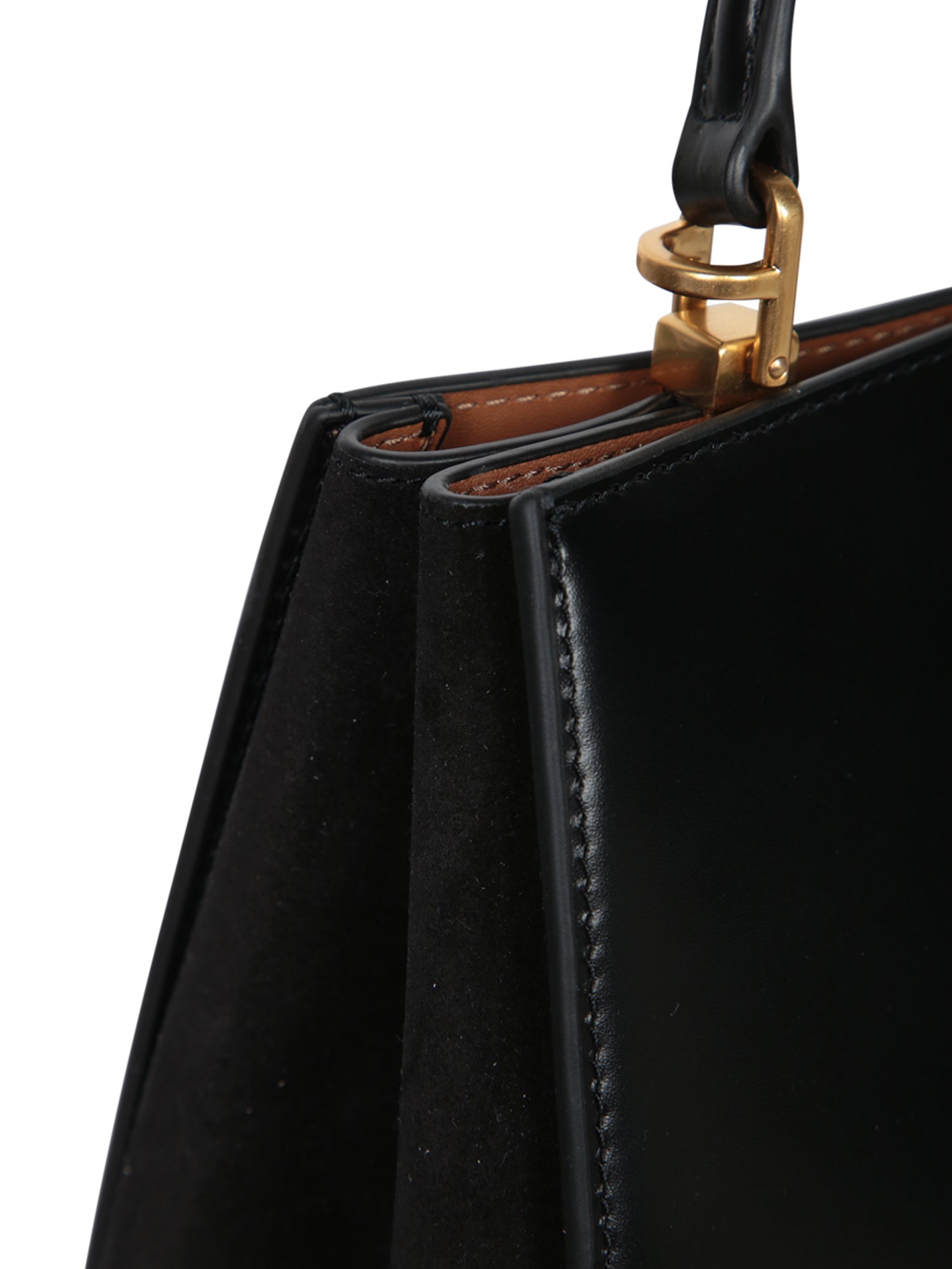 Crafted from high-quality smooth leather. Top handles and a removable shoulder strap. Features a magnetic snap closure mechanism.