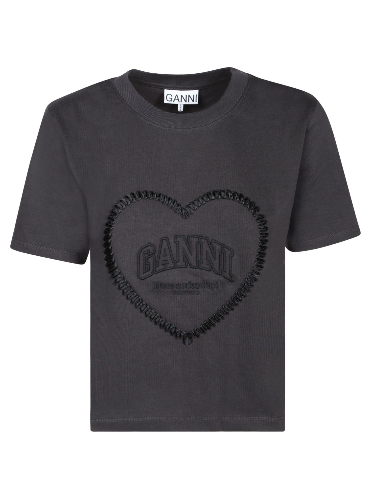 Short-sleeve cotton T-shirt in black. Crew neck. Central GANNI embroidered logo with heart-shaped detail.