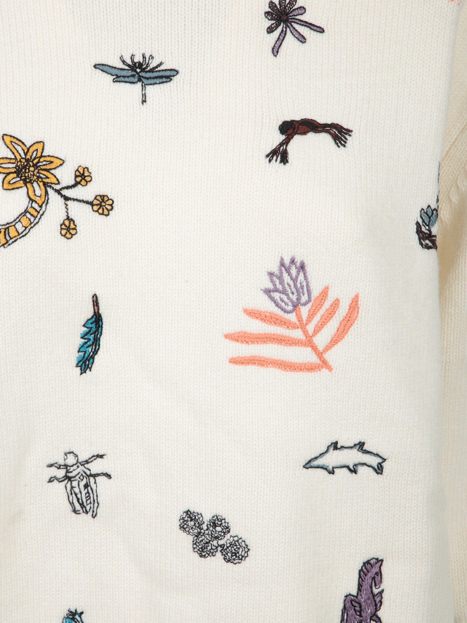 Long-sleeve knitted sweater. Colorful embroidered design featuring natural elements. Ribbed finishes at collar, cuffs, and hem.