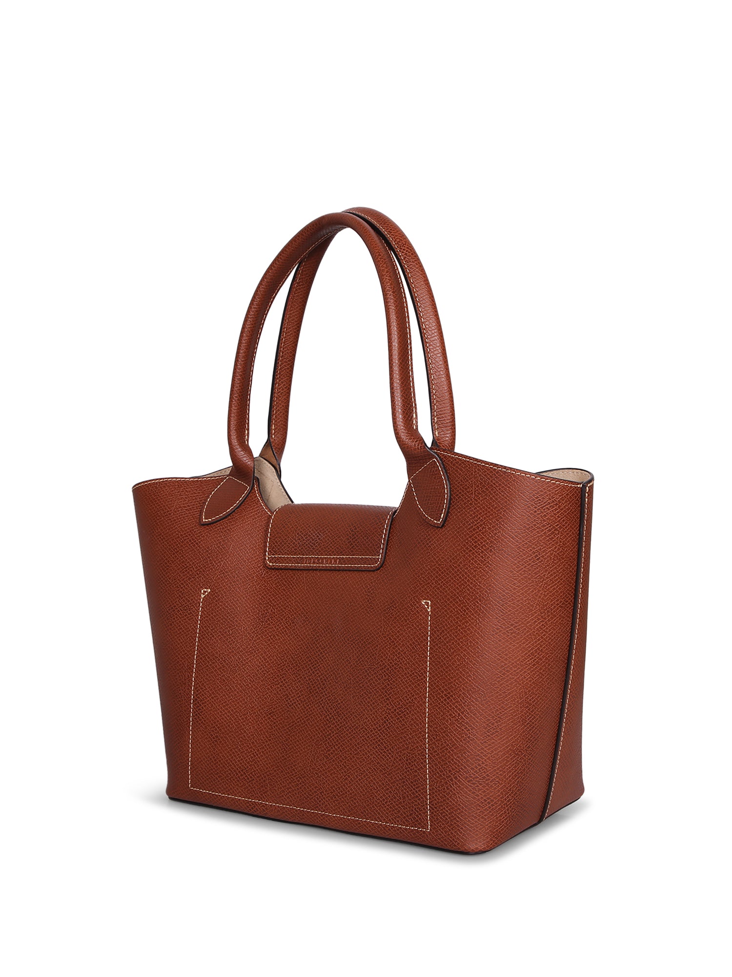 High-quality brown leather. Minimalist design. Flap closure with button. Rounded handles.