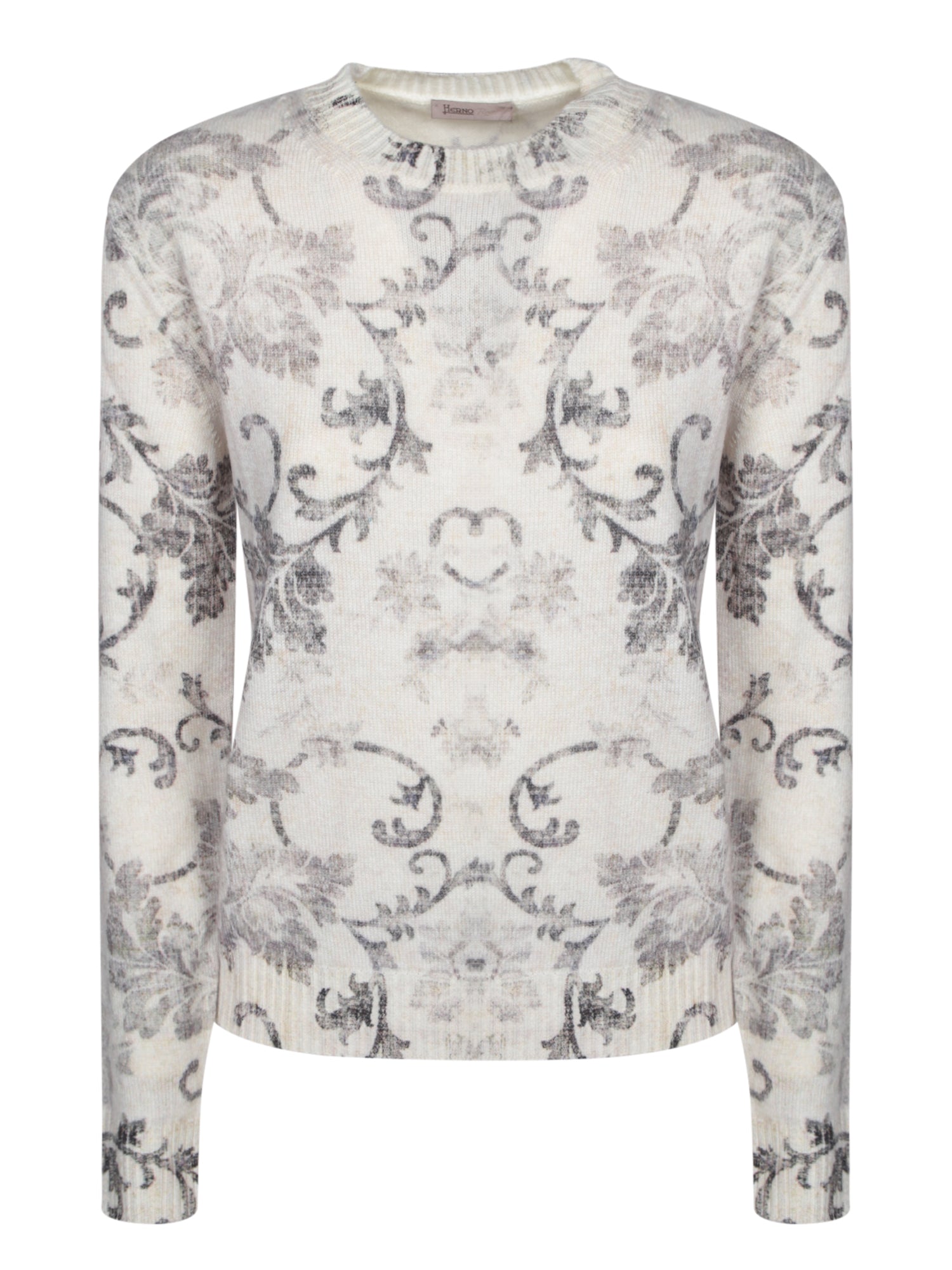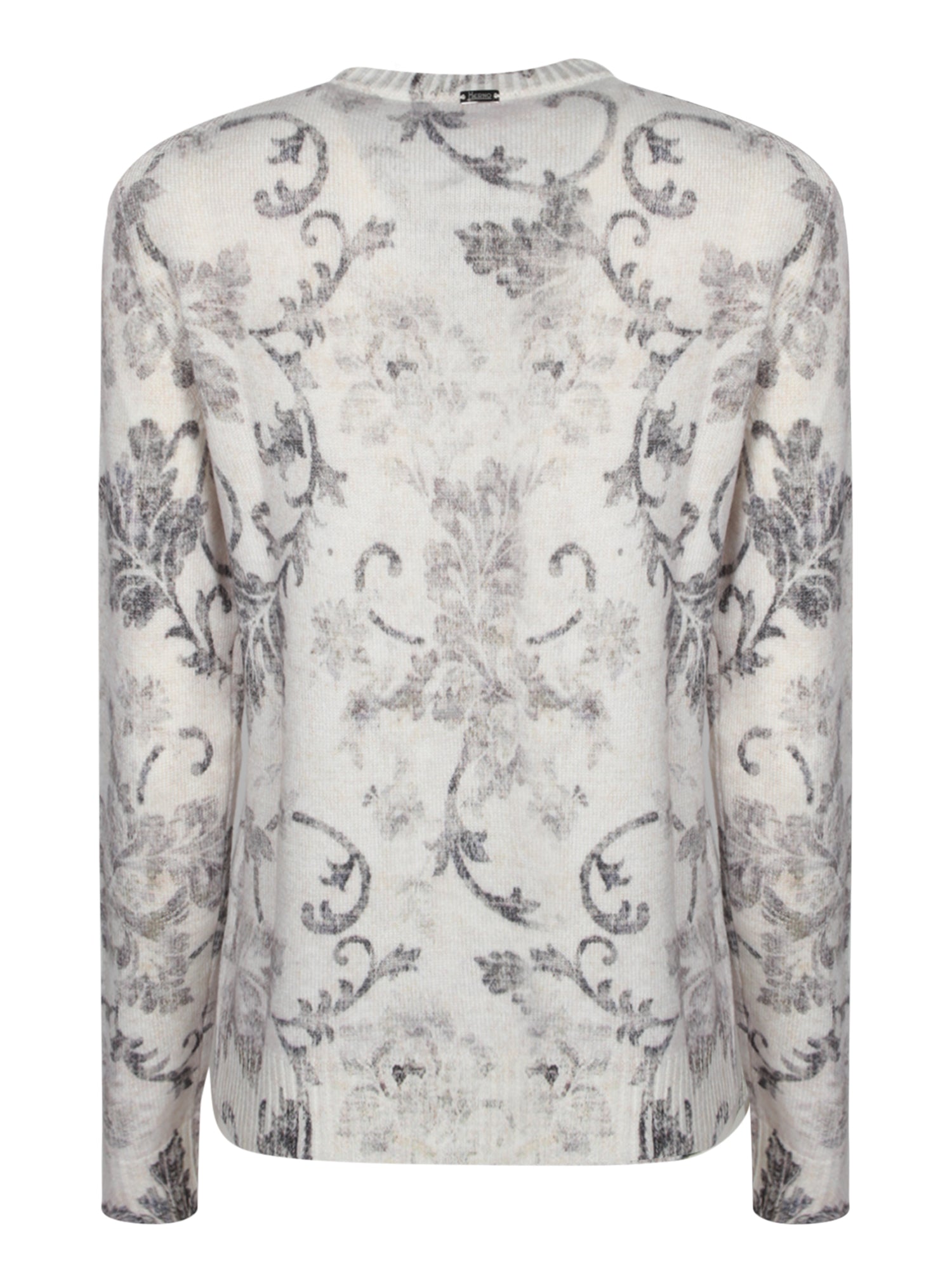 Long sleeve sweater. Crew neck. Floral pattern on a grey background.