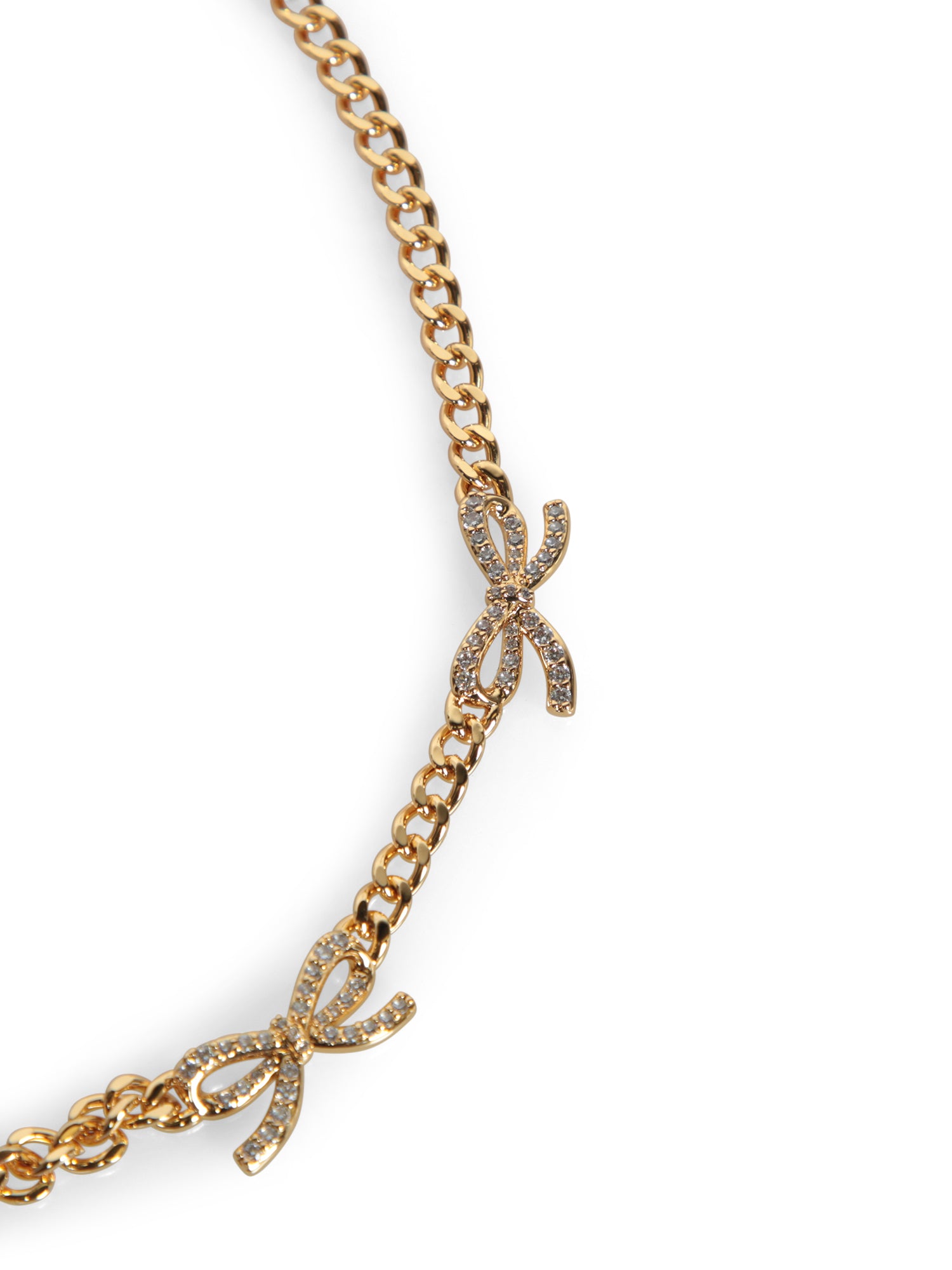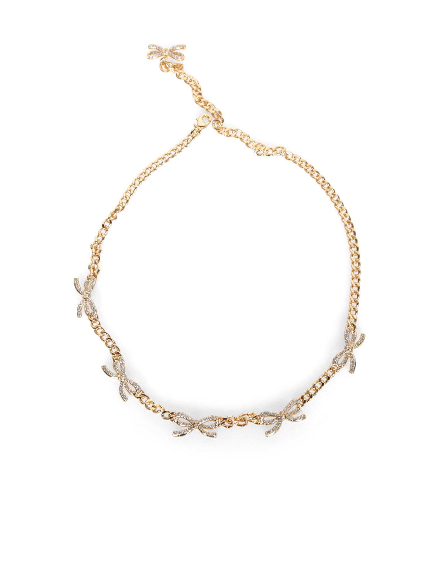 Gold necklace with bow details and crystals. Adjustable closure. Elegant and bright.