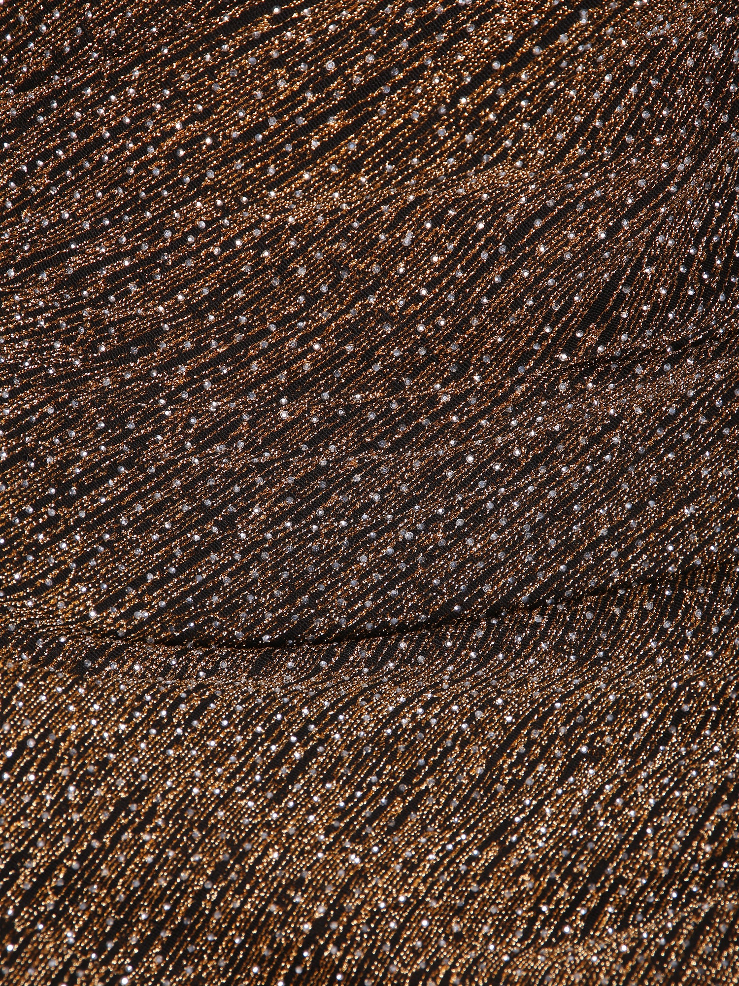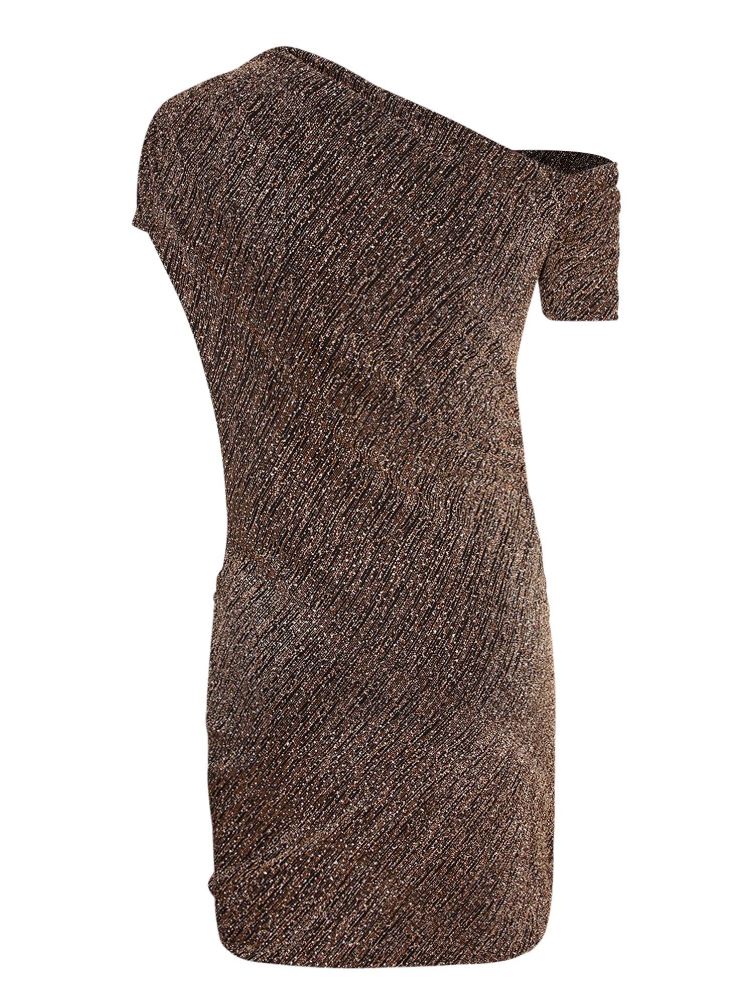 One-shoulder dress. Gold lurex fabric with a shiny effect. Asymmetric cut.