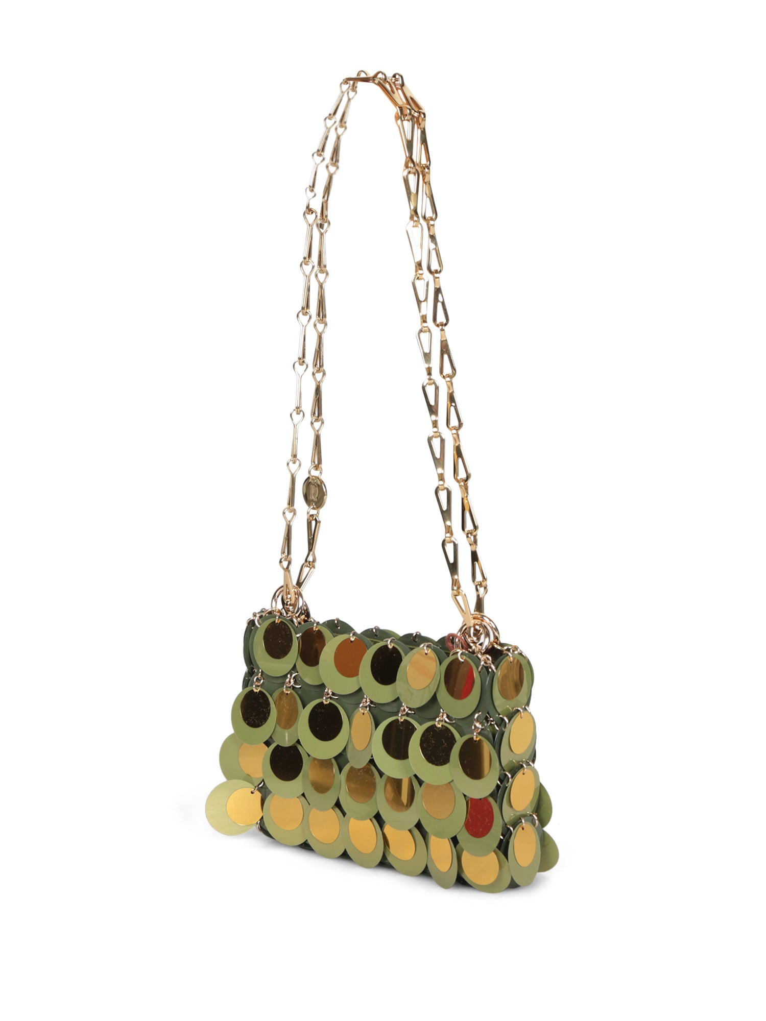 Bag featuring overlapping circular decorations in shades of green and gold. Thin chain with circular metallic detail.