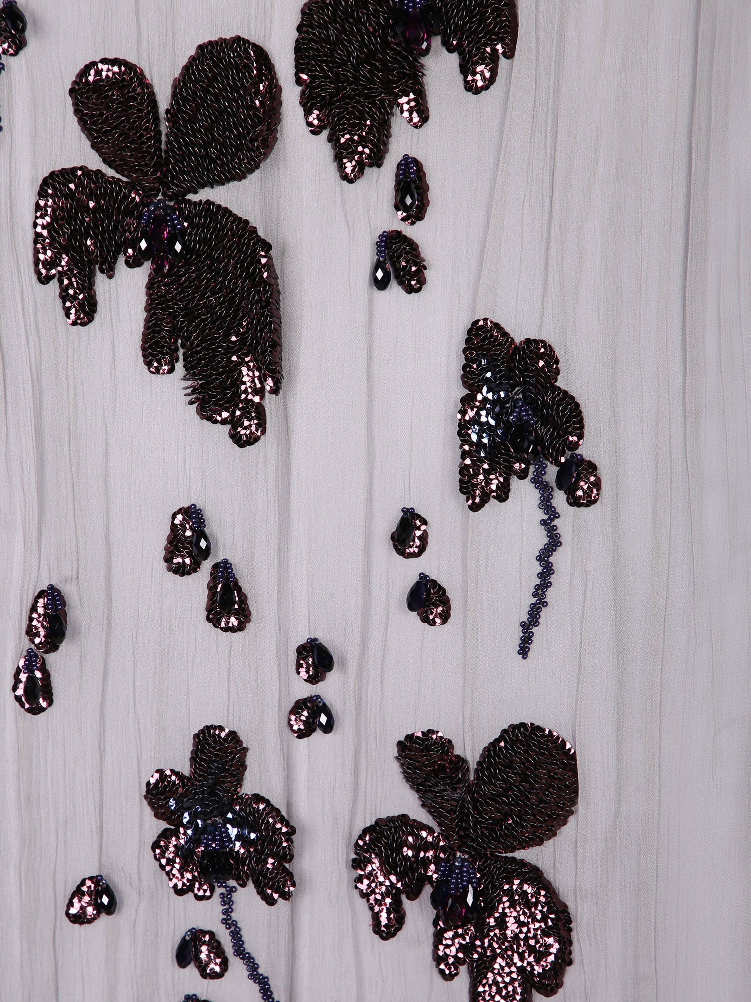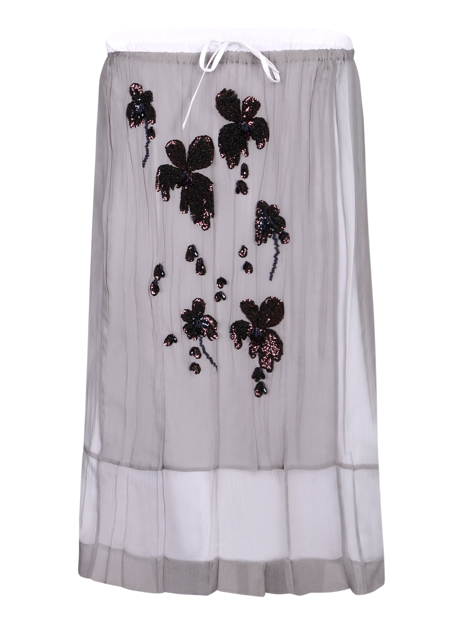 Chiffon fabric. Floral embroidery with sequins. Elastic waist with drawstring.