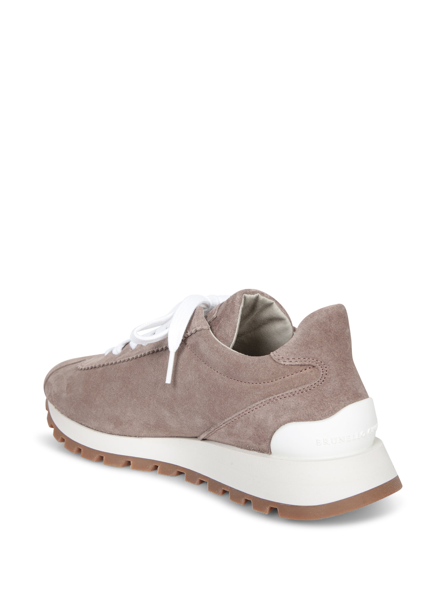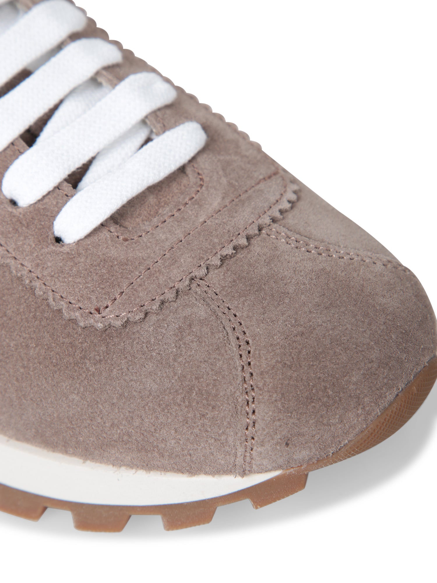 Suede sneakers with shiny Monile details. White fabric laces. Notched rubber sole.