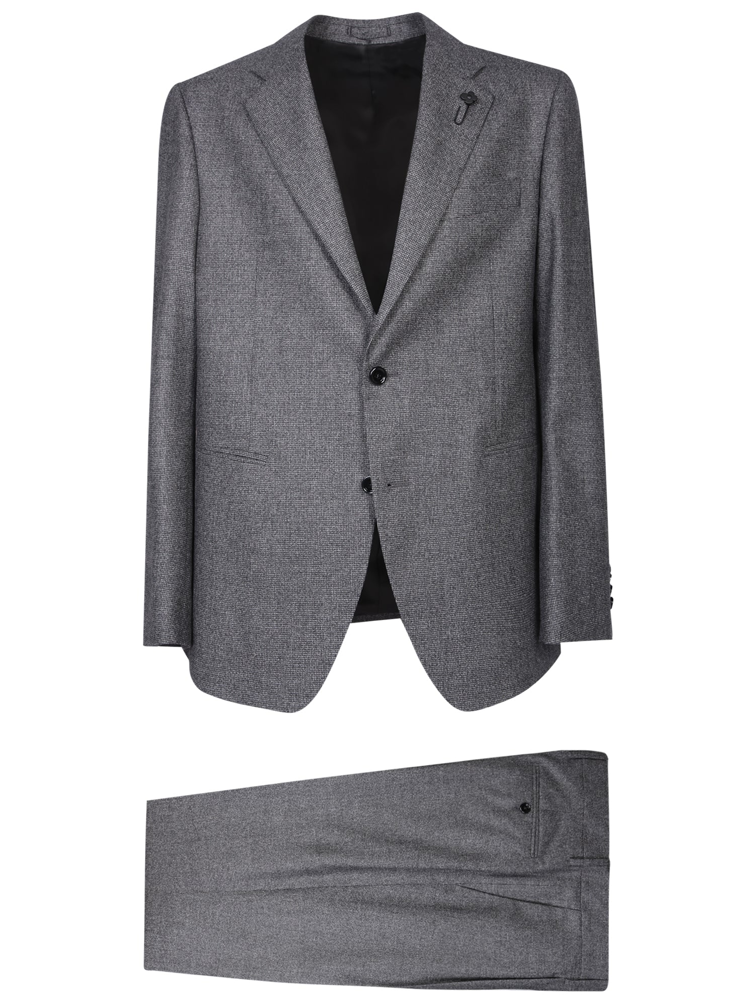 Tailored suit in wool blend fabric. Slim fit cut with two-button closure. Subtle logo pin on the lapel.
