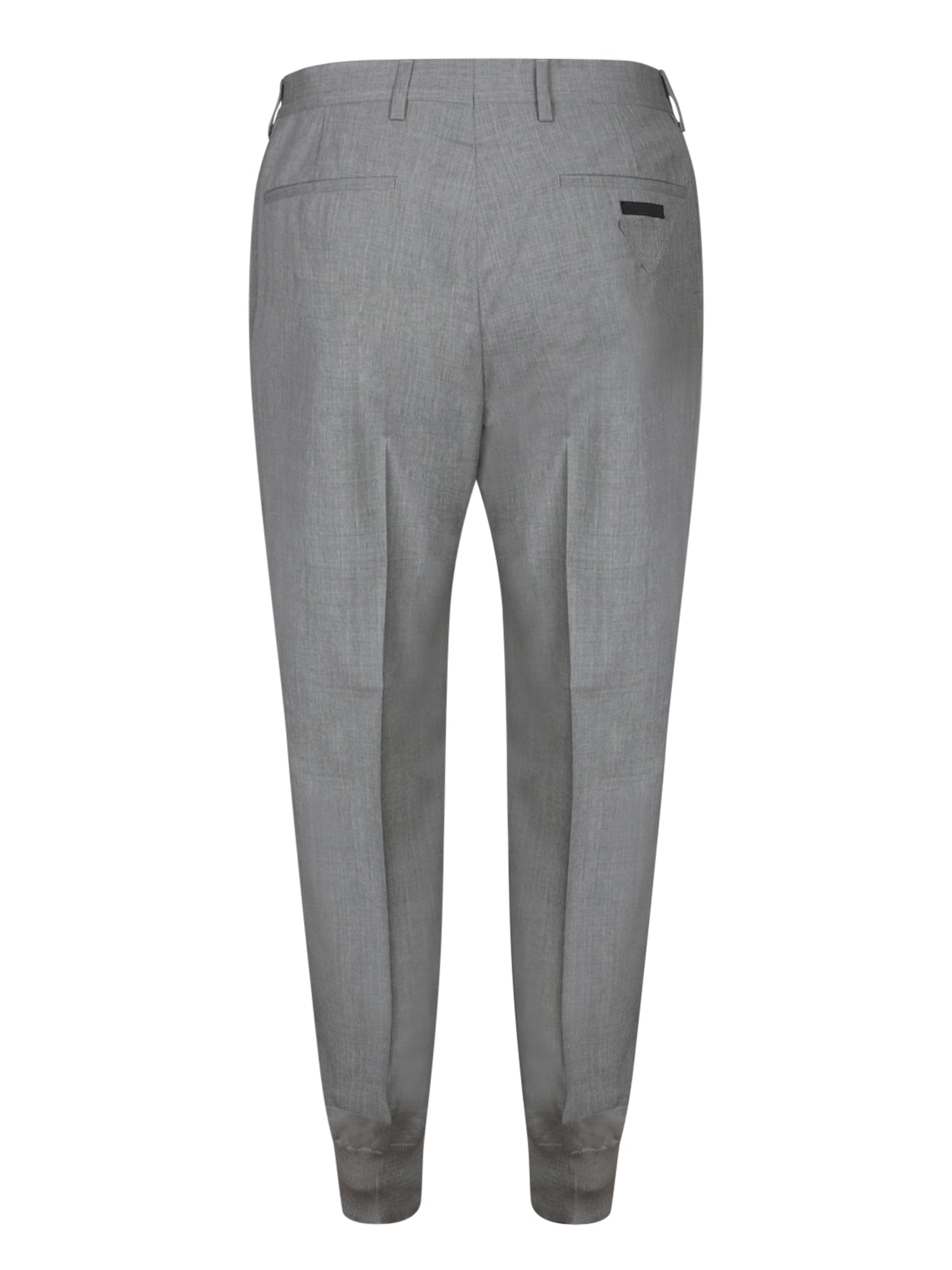 These elegant PRADA grey wool trousers feature a clean and classic cut, with a traditional closure and a cuffed finish that adds a touch of sophistication.