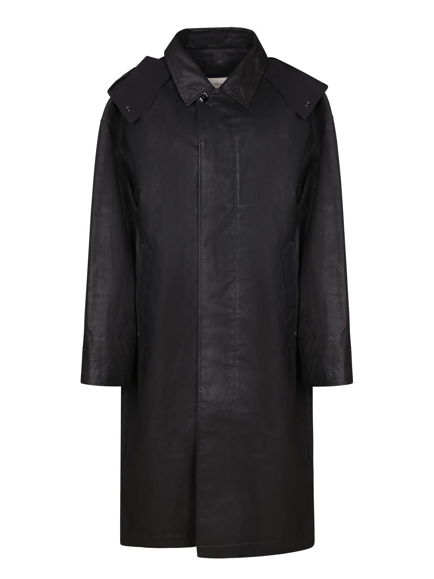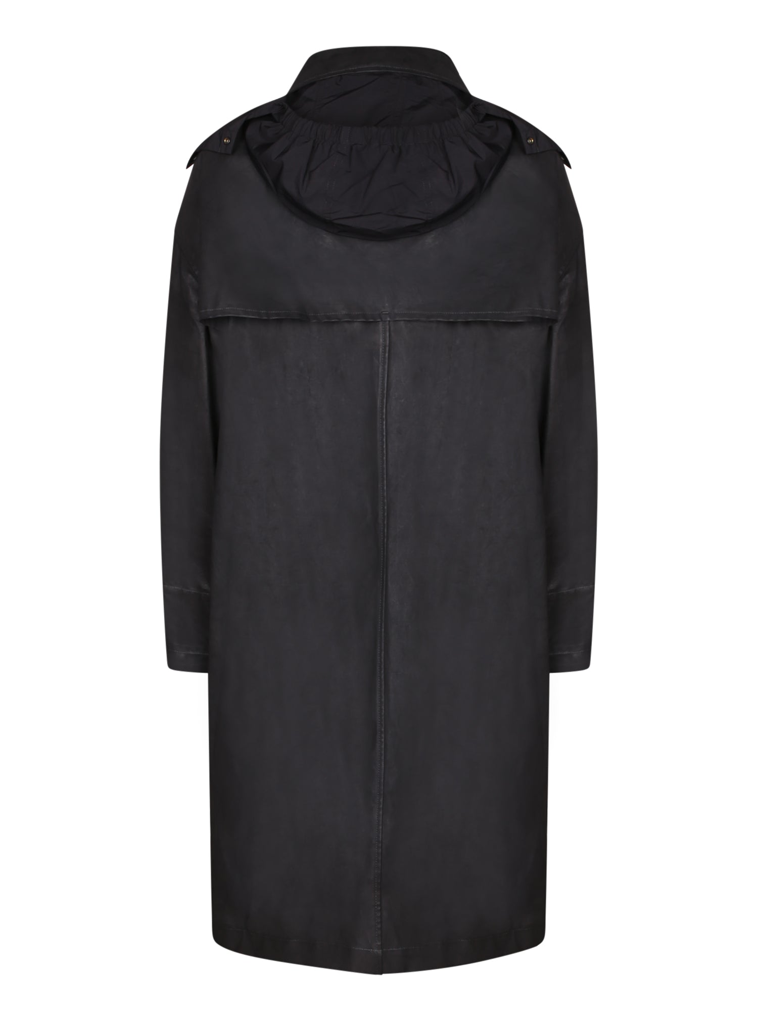 Long coat in waterproof technical fabric. Features a hood, front zip and snap button closure, side zip pockets.