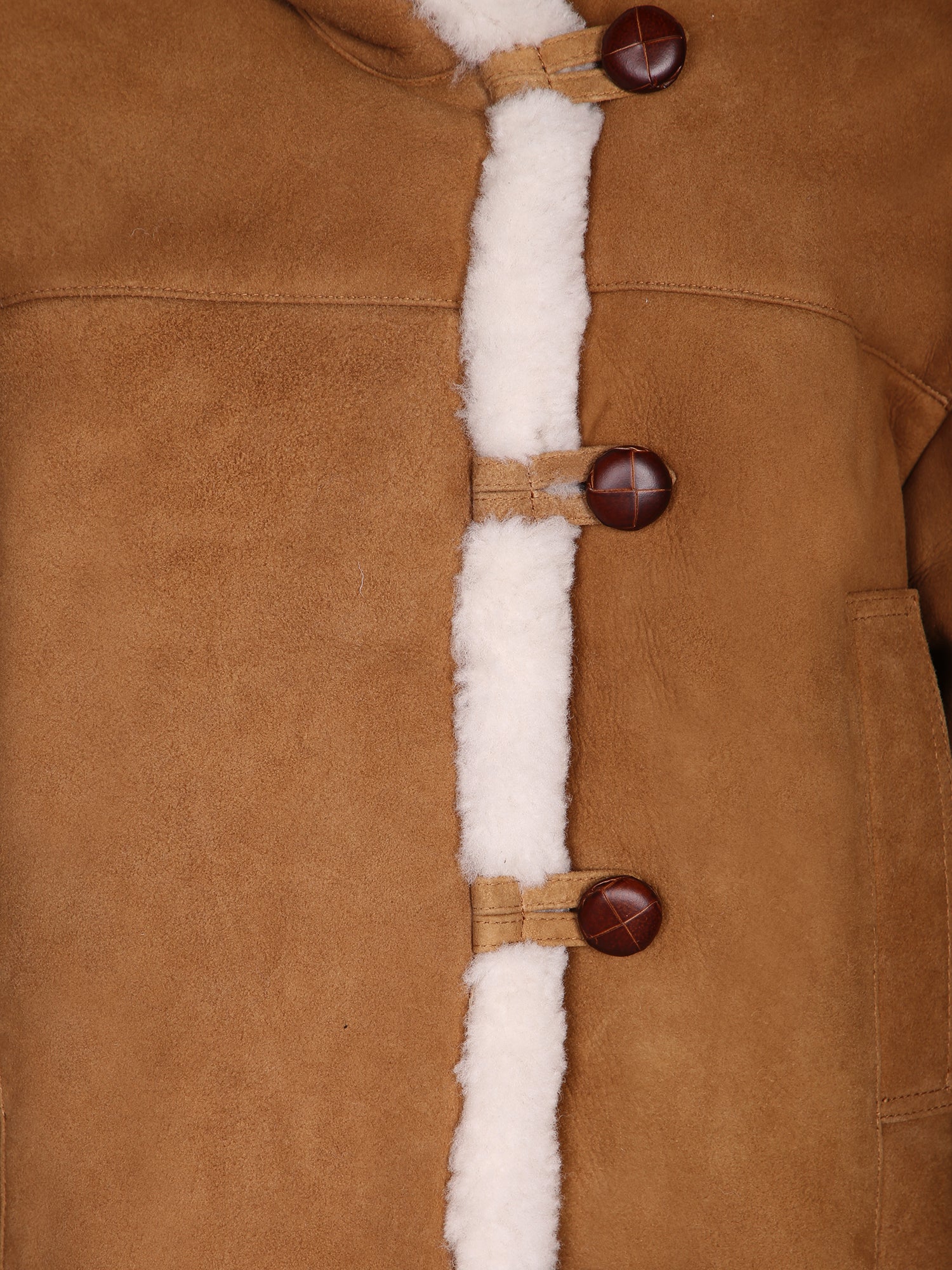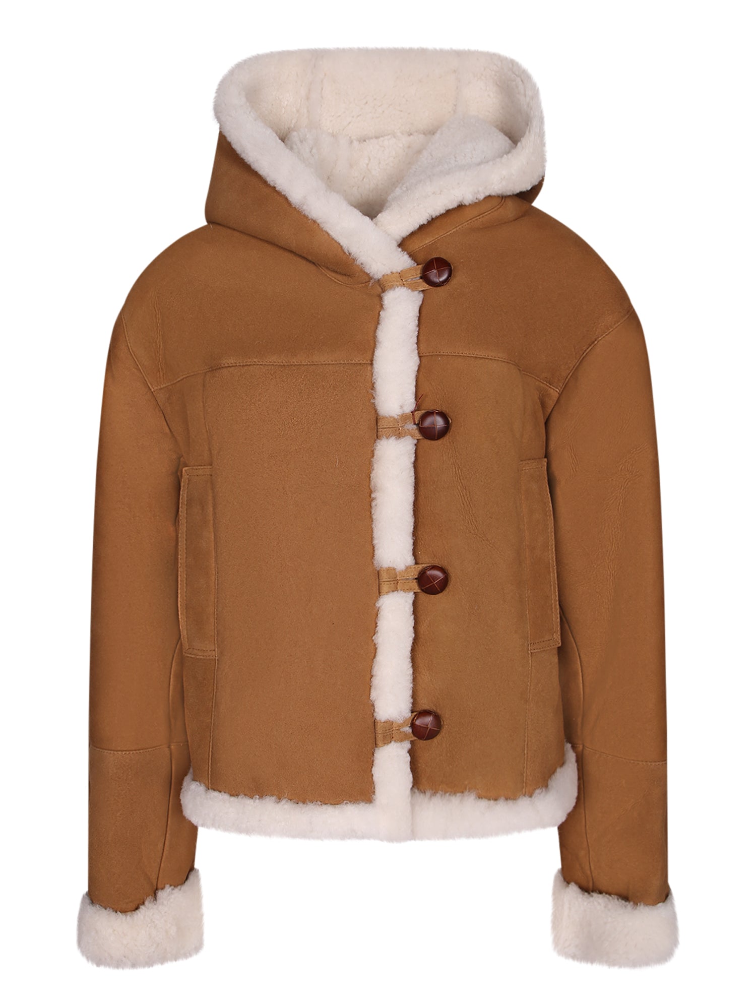 Sheepskin jacket with hood. Front closure with wooden buttons. Cuffs and hem in synthetic fur.