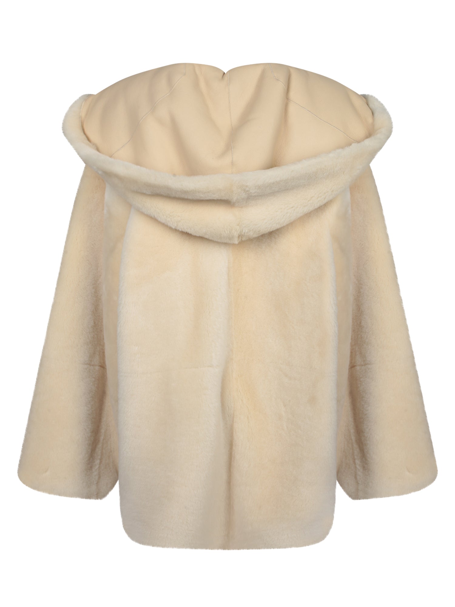 Shearling jacket with hood. Reversible design. Ivory leather trim.
