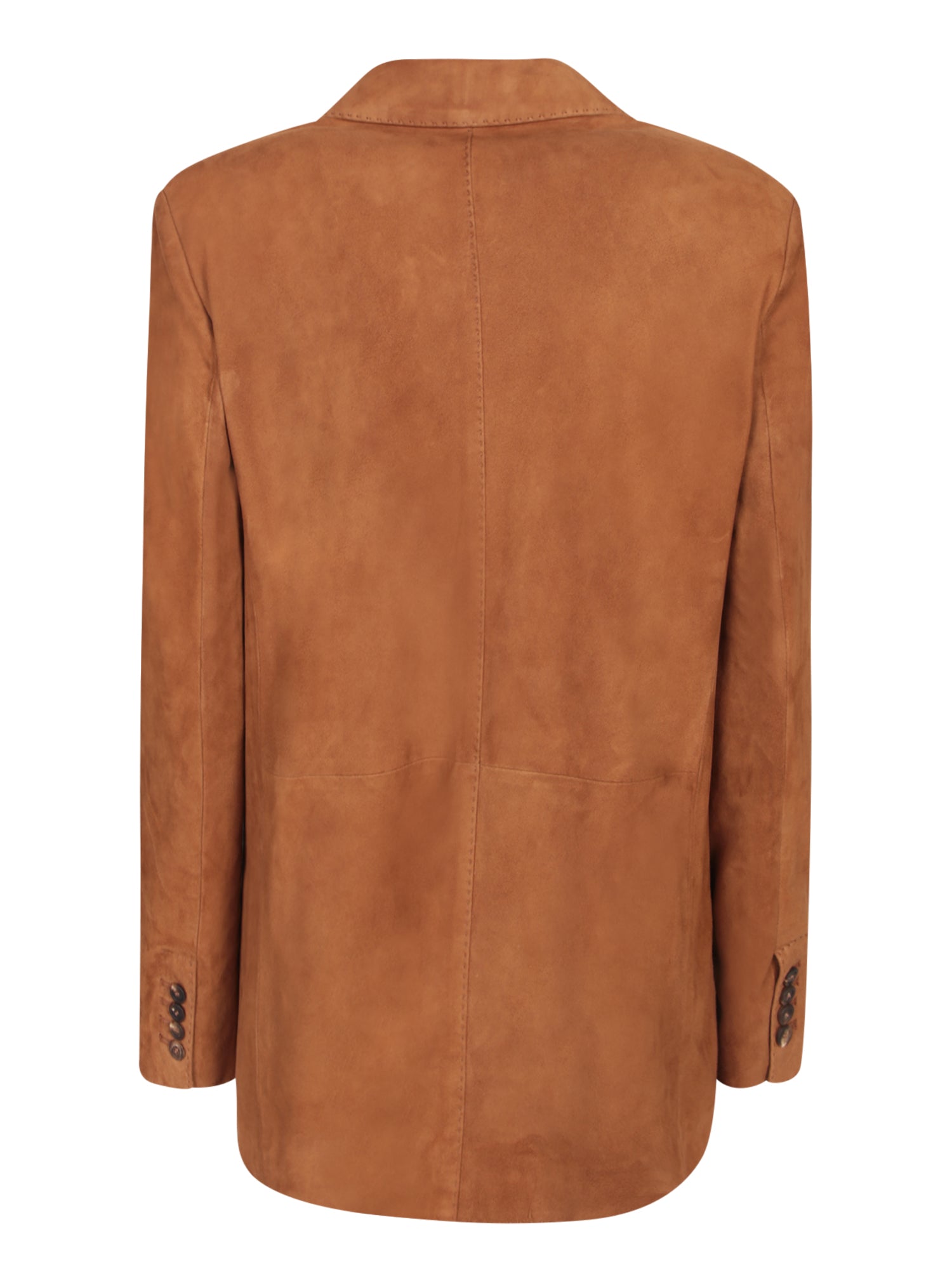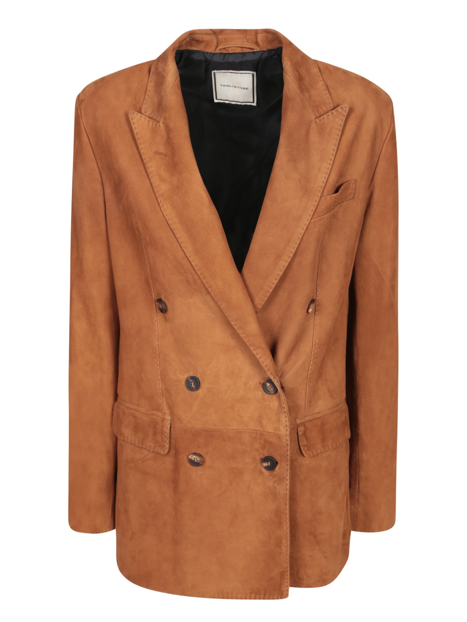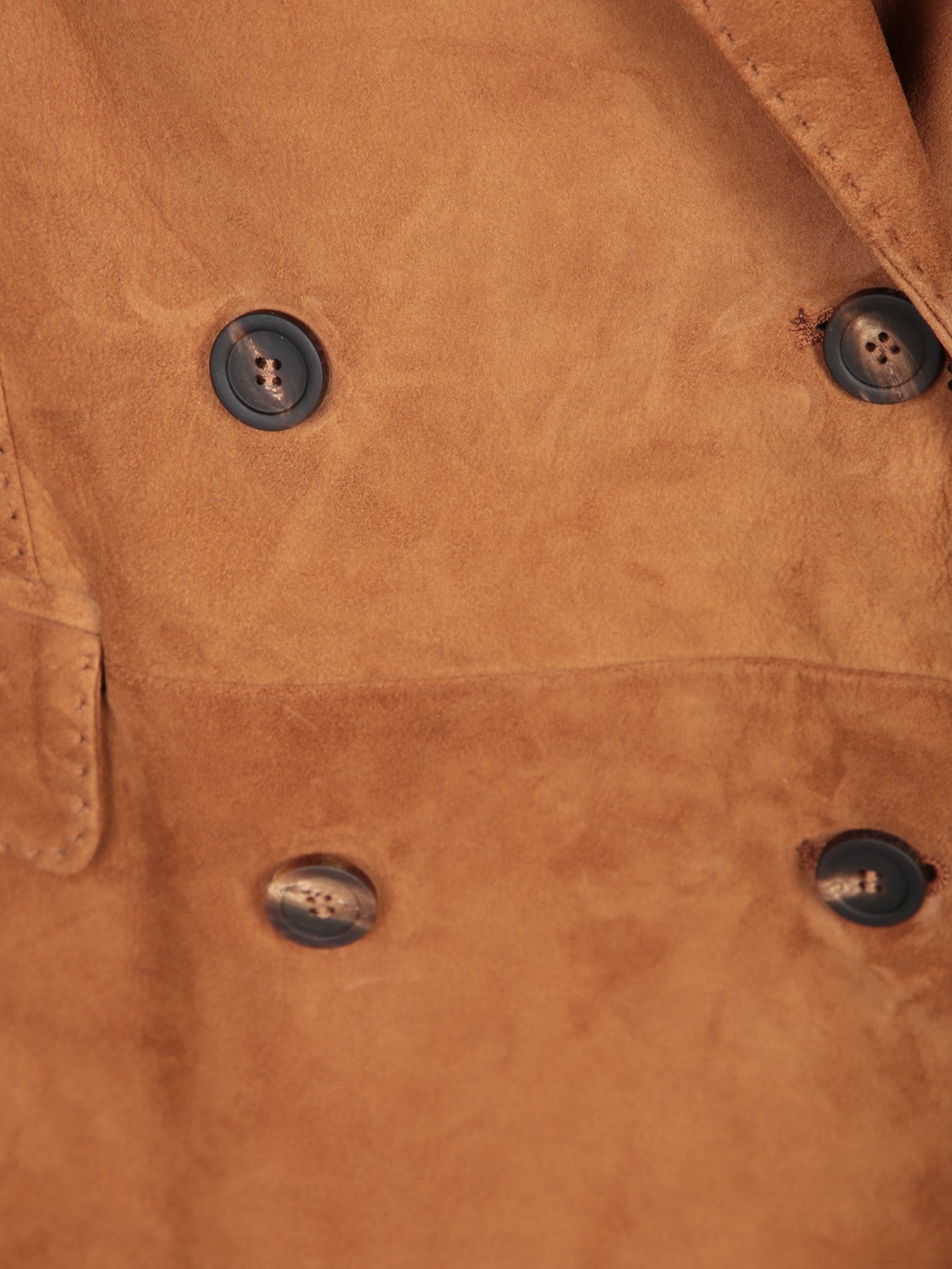 Double-breasted suede jacket. Flap pockets and chest pocket. Classic lapels.