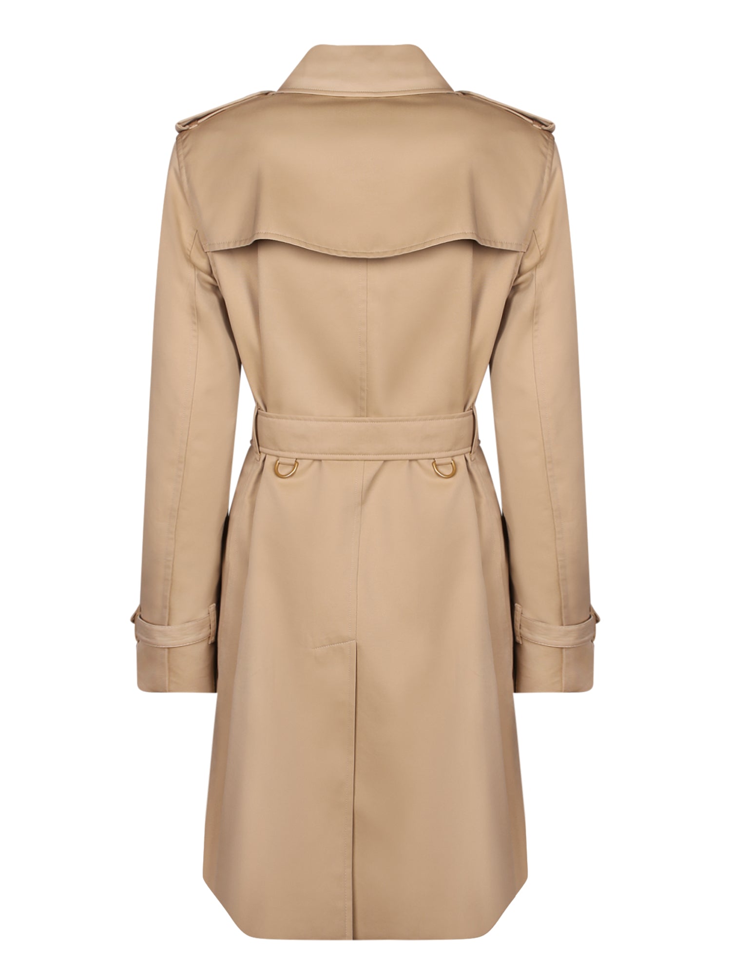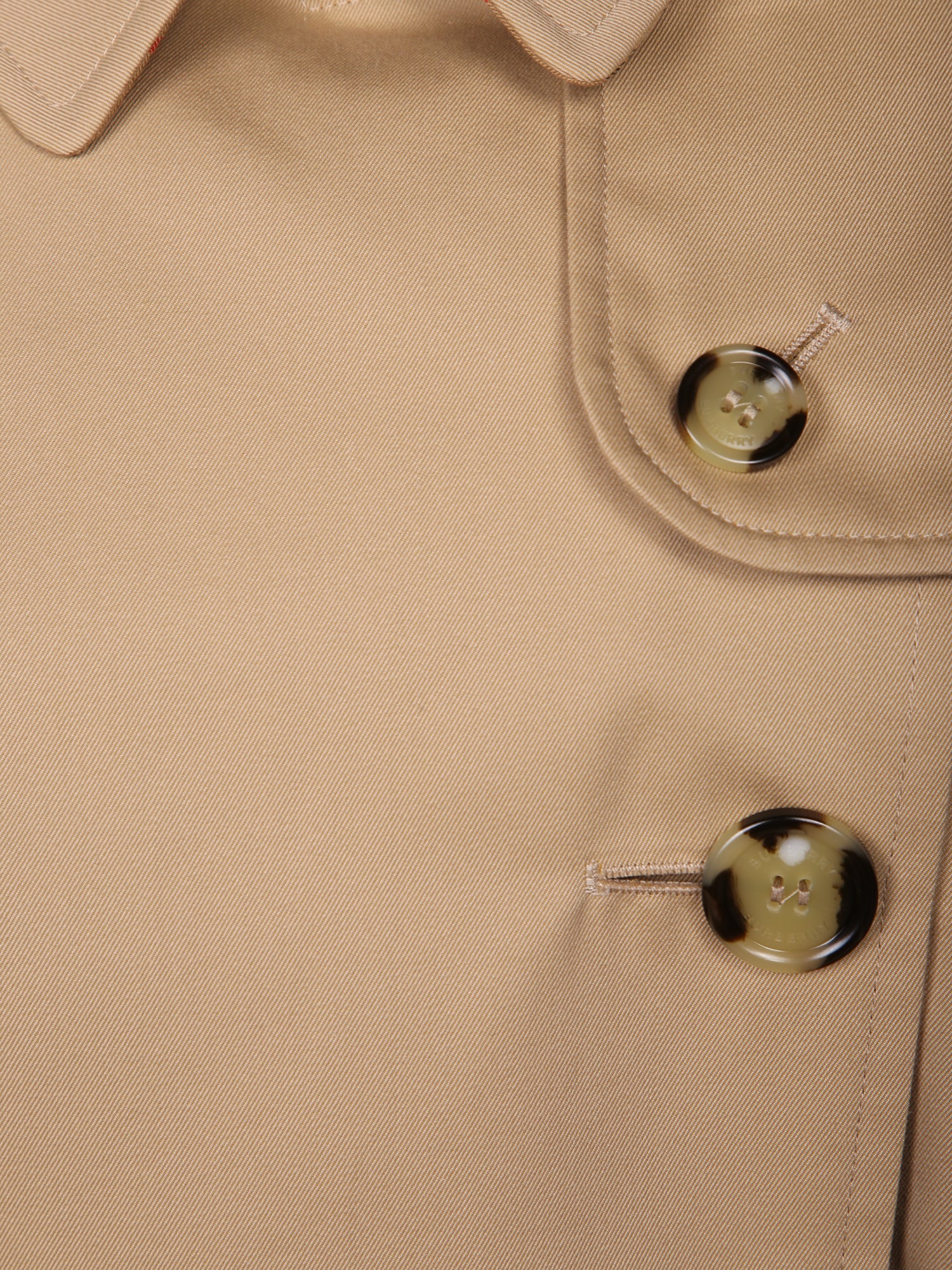 Cotton gabardine trench. Double-breasted with buttons. Belt at the waist. Classic collar.