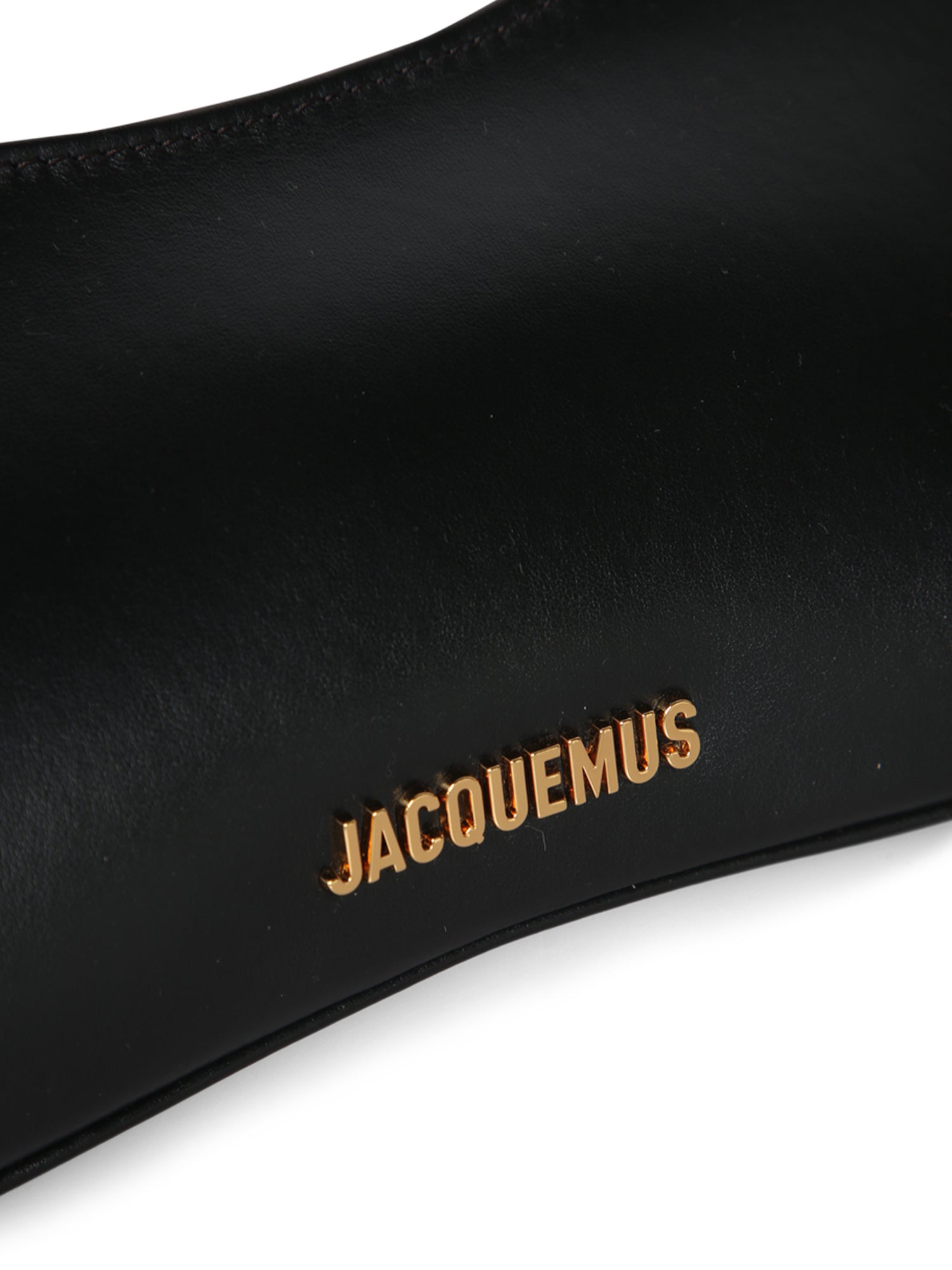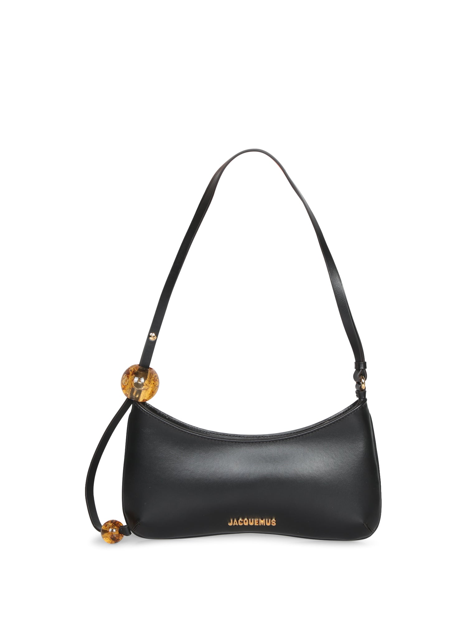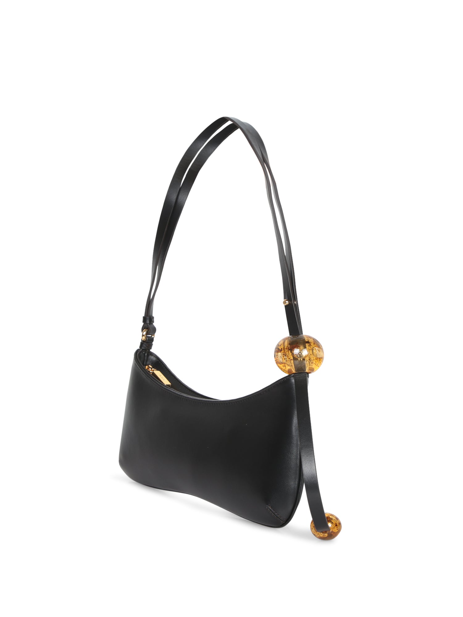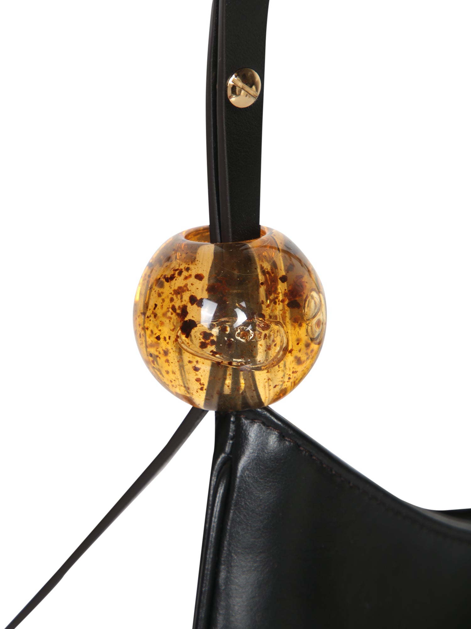 Black leather shoulder bag. Amber pearl details. Front golden logo.