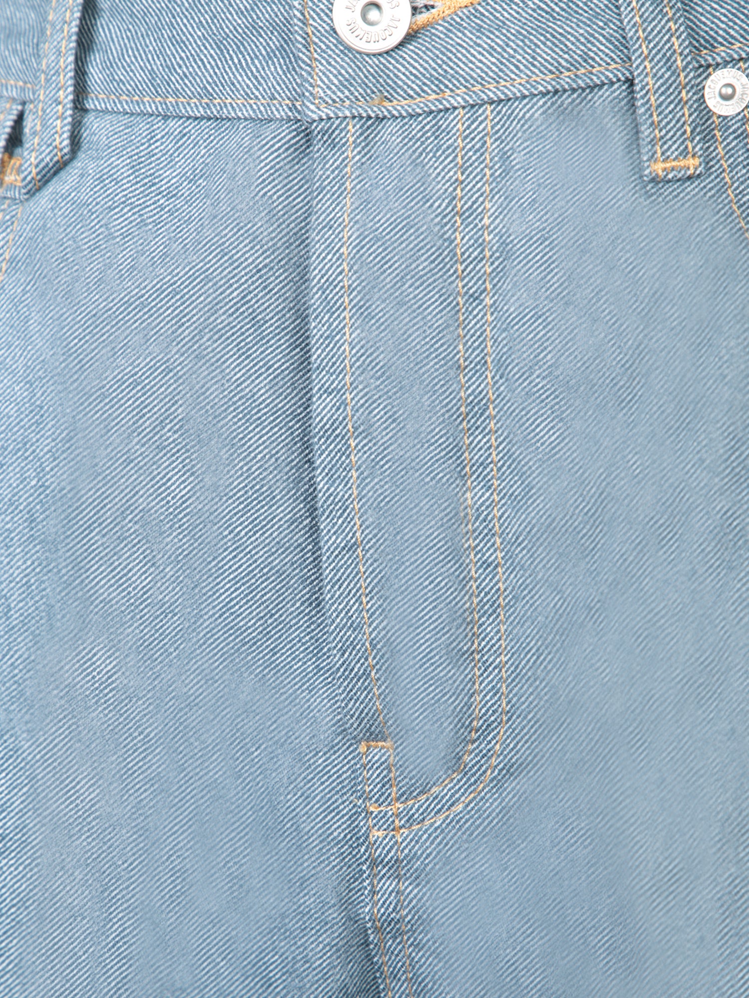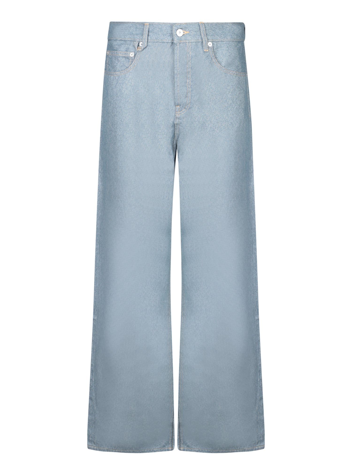 Wide leg jeans with five pockets. Front button and zip closure. Belt loops.