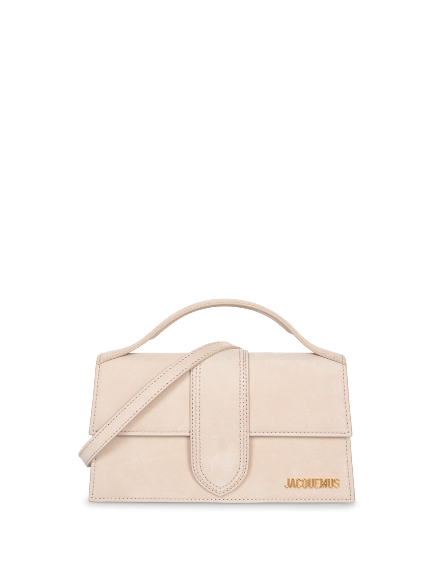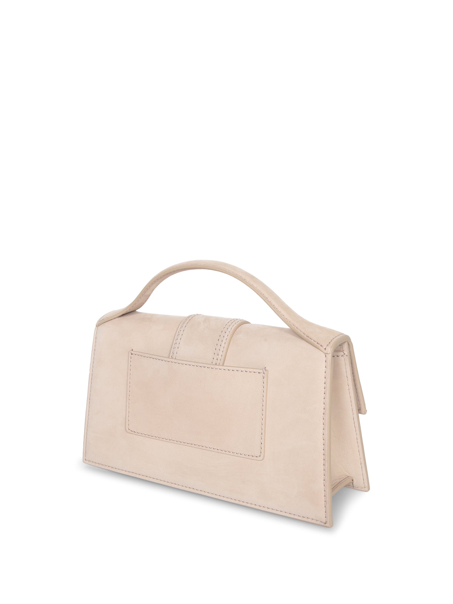 Beige leather bag with adjustable shoulder strap. Flap closure with hidden magnet. Golden logo on the front.