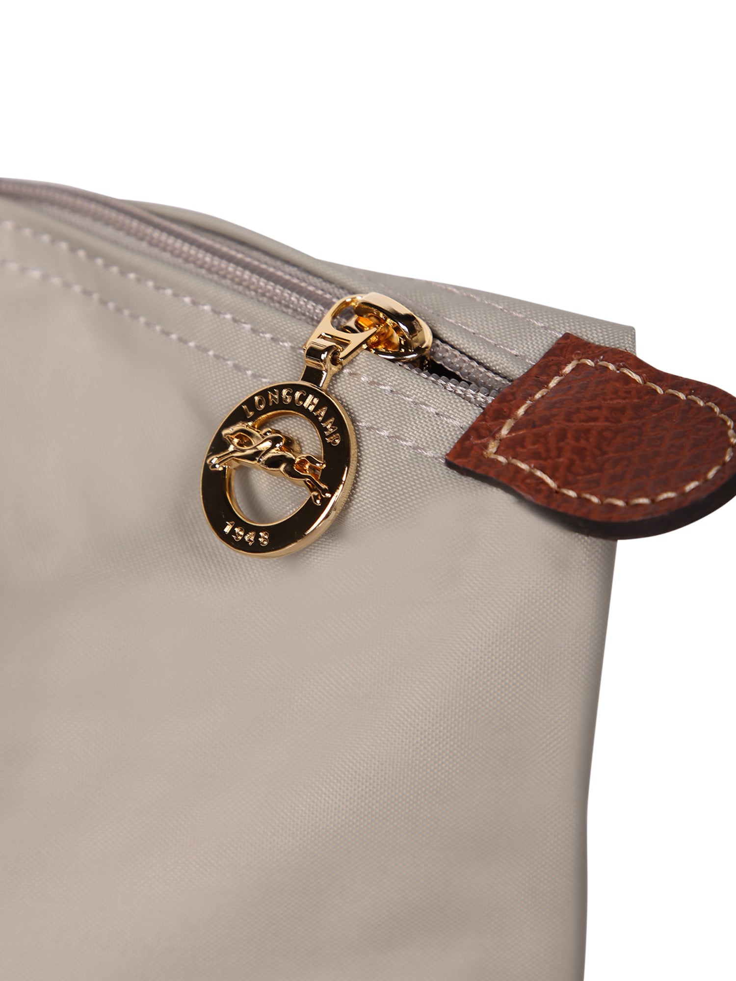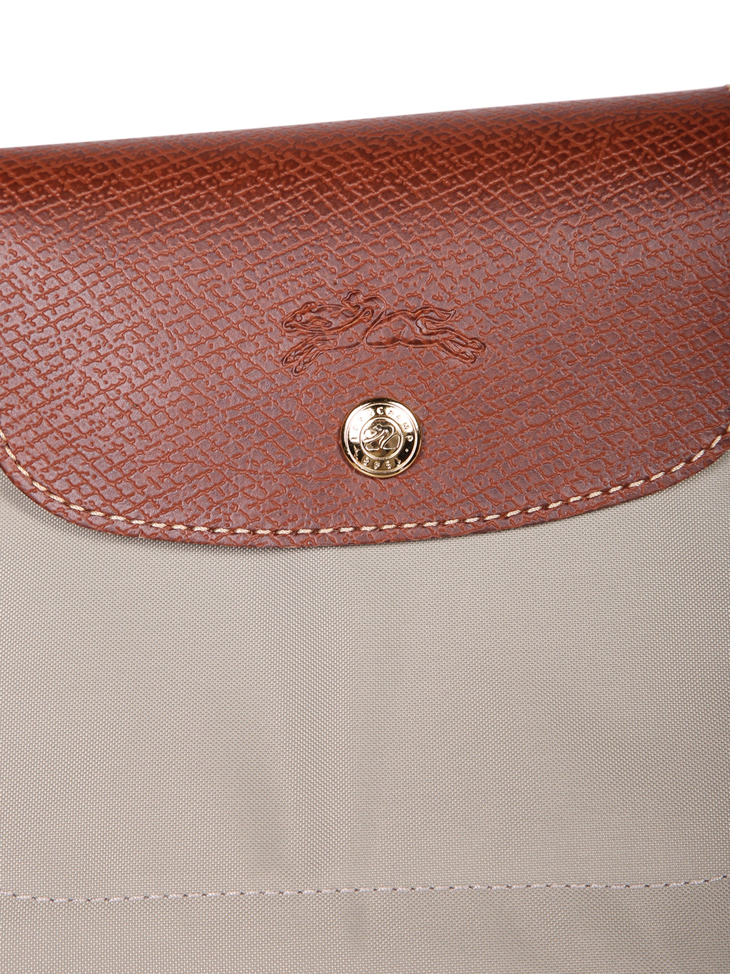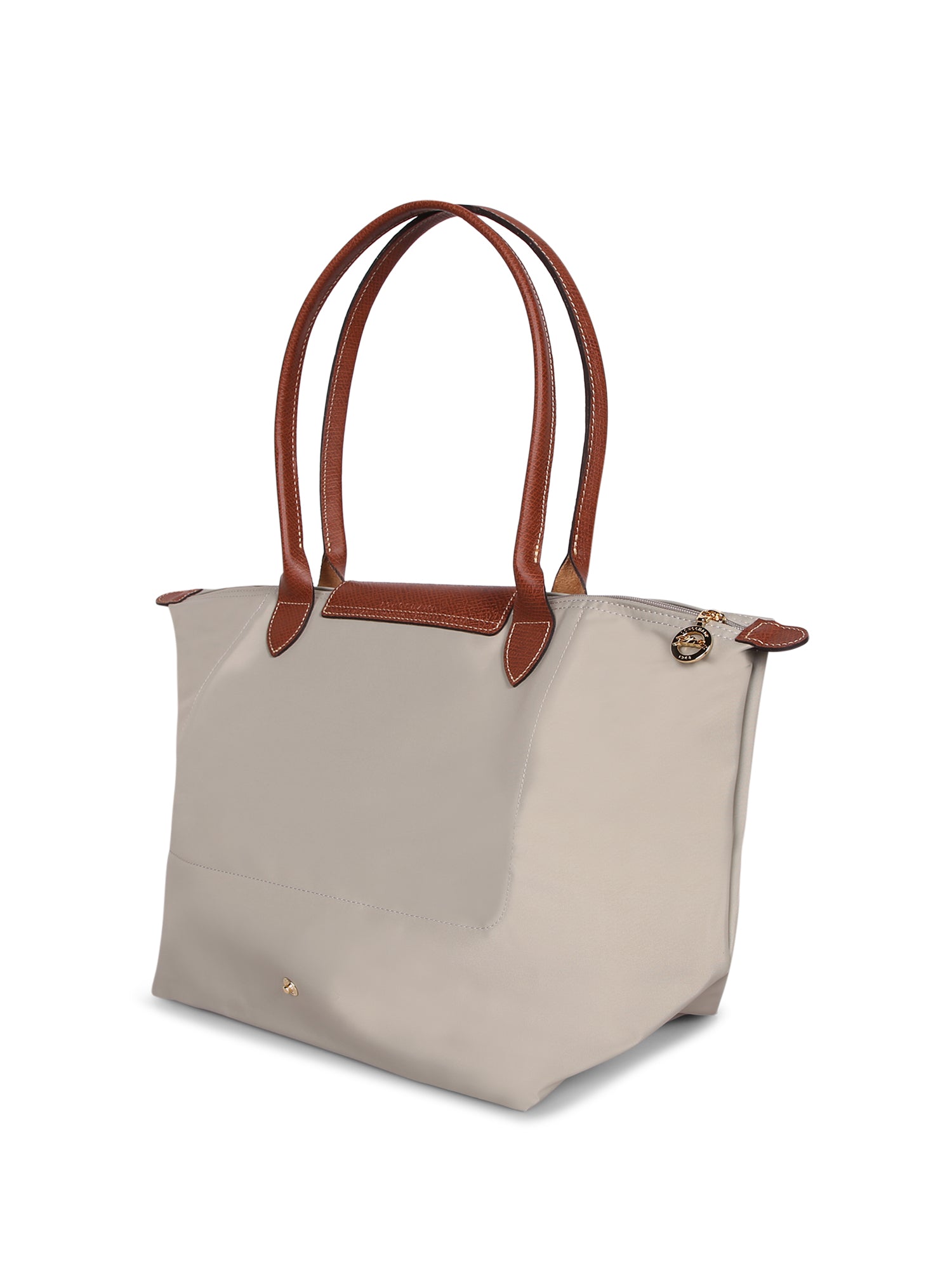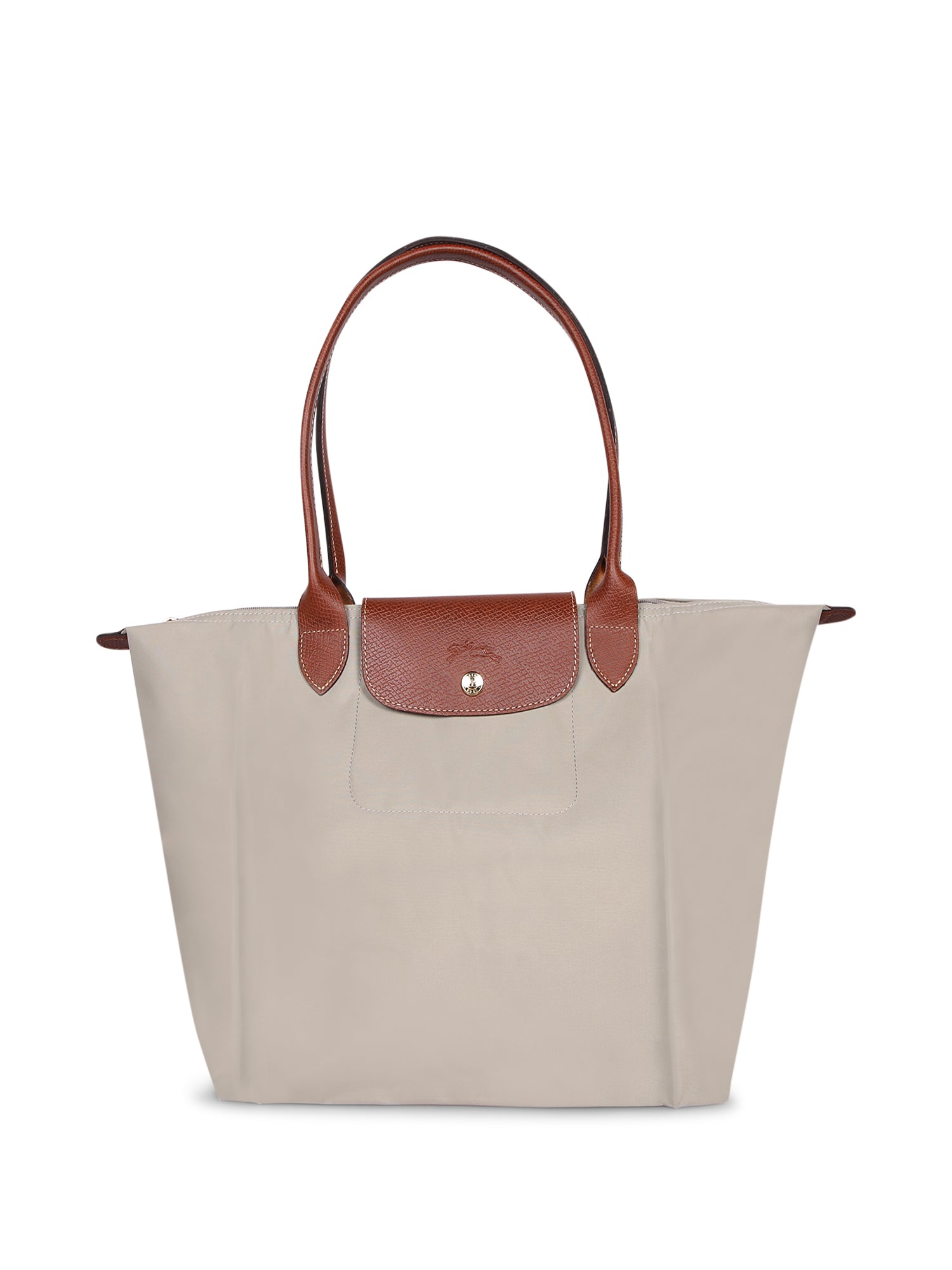 Made of lightweight nylon. Long brown leather handles. Snap button closure.