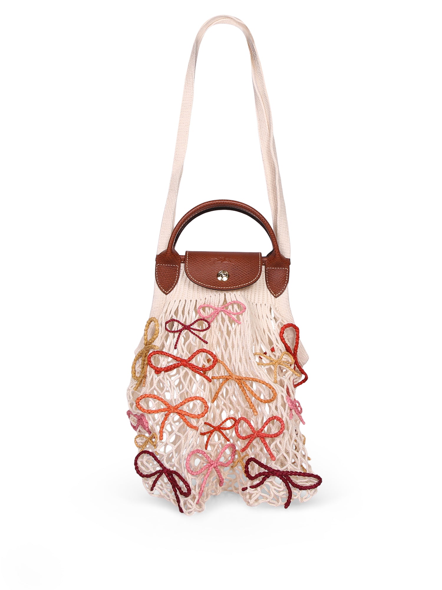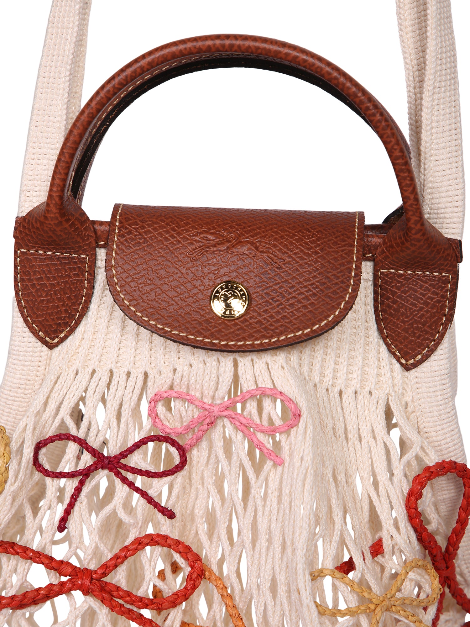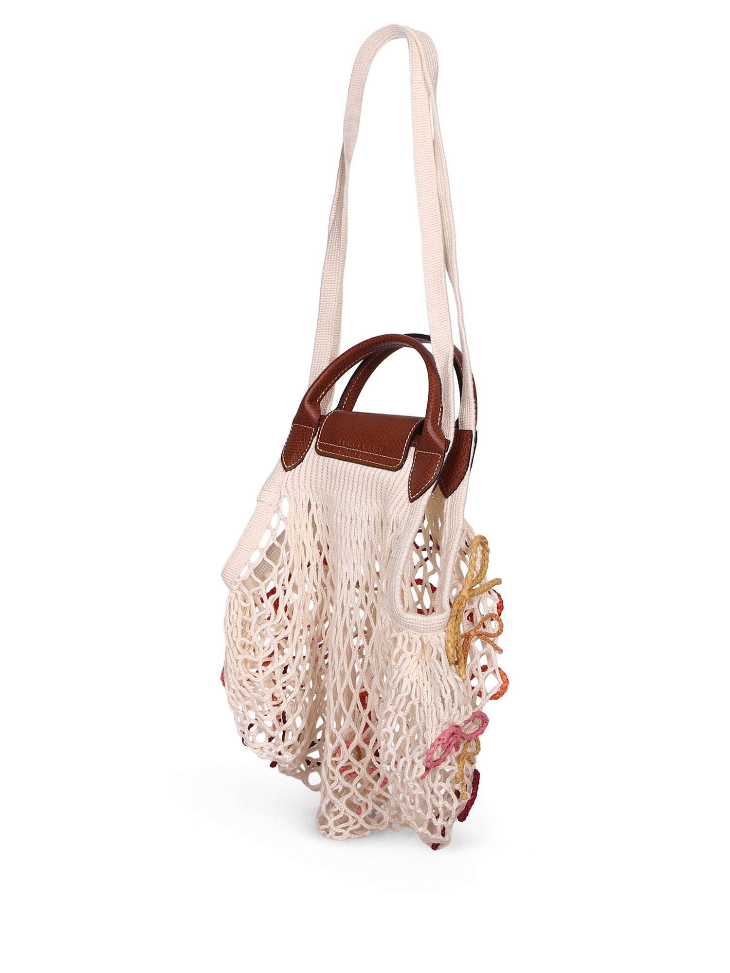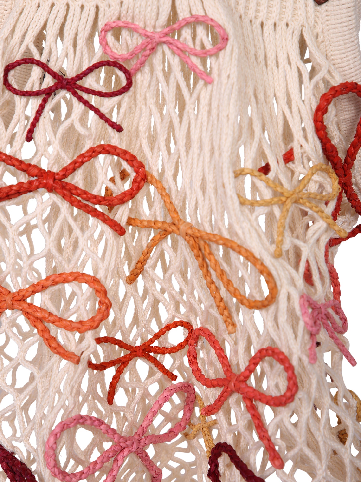 Raphia netting. Leather handle. Colorful ribbon decorative motifs.