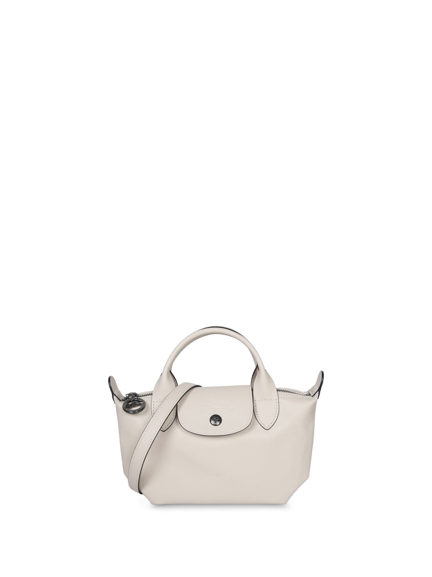 This elegant cream leather bag offers a minimalist aesthetic with a practical snap closure and an iconic removable strap for heightened versatility.