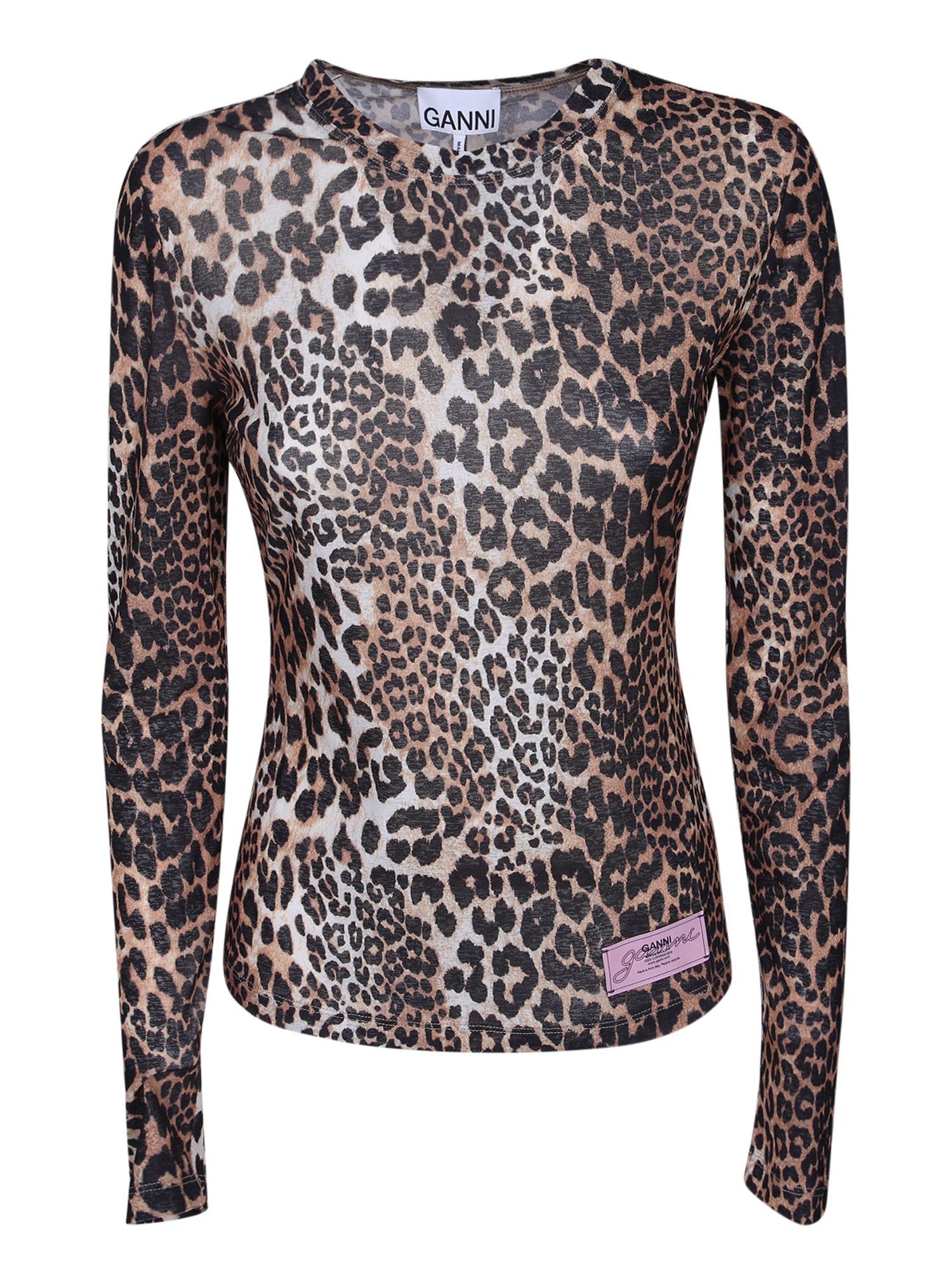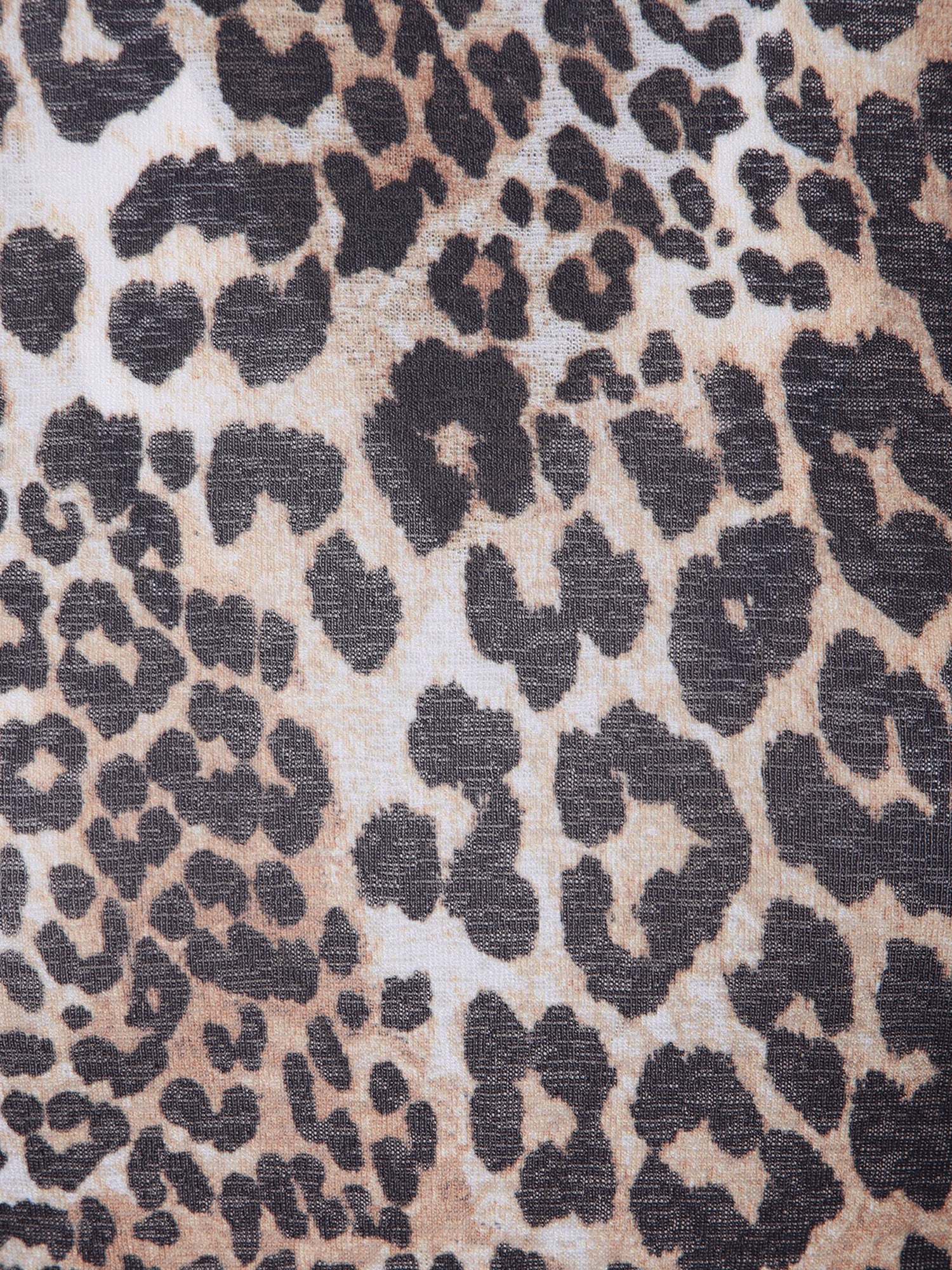 Long sleeve transparent mesh top. Leopard print in shades of brown and beige. Crew neck.