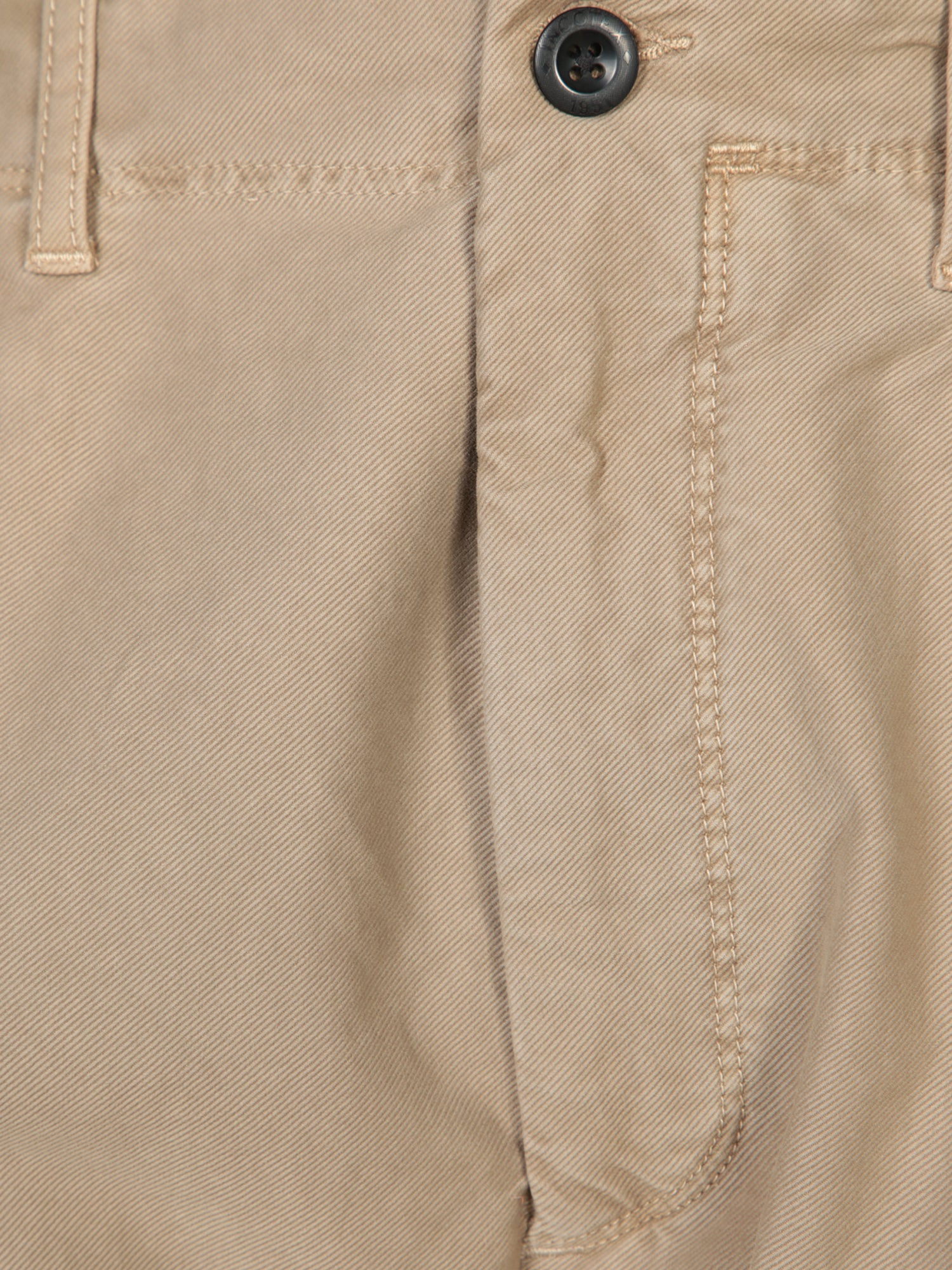 Zip and button closure. Slanted side pockets. Welt back pockets.