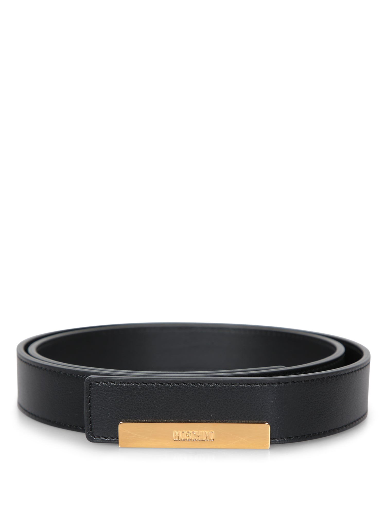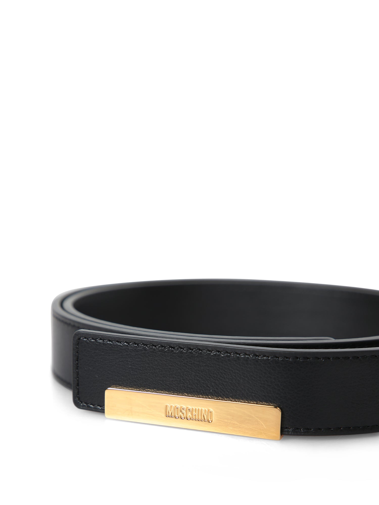 High-quality leather belt. MOSCHINO gold logo plaque. Adjustable closure.