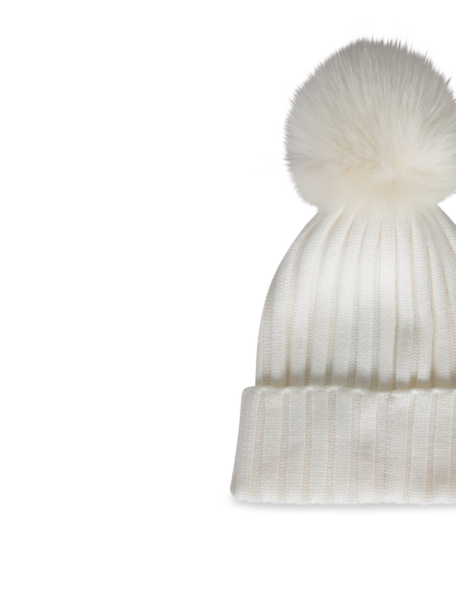 Ribbed knit beanie with synthetic fur pom pom. Front Moncler logo.
