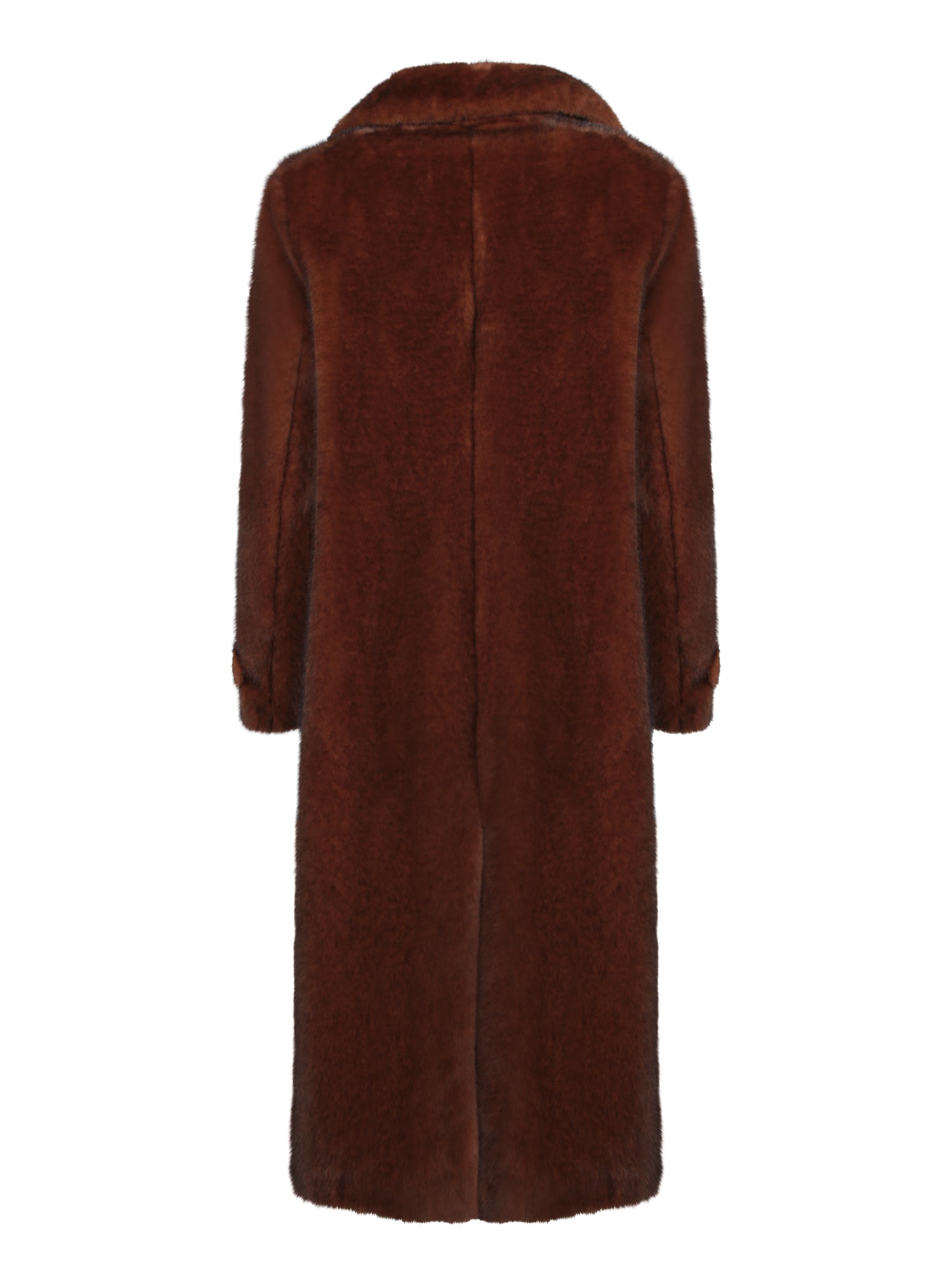 Long coat with wide lapel collar, button front closure, flap pockets.