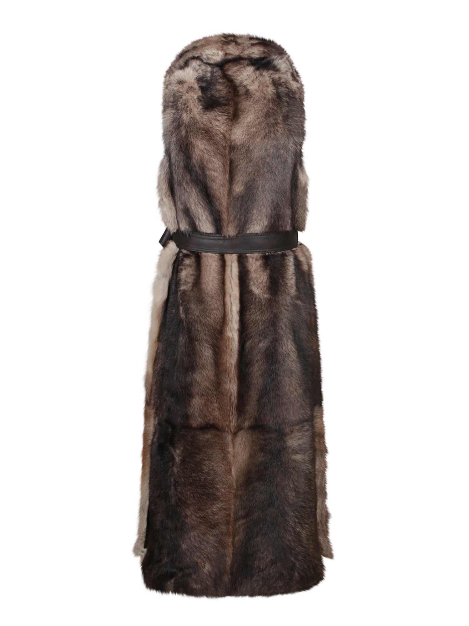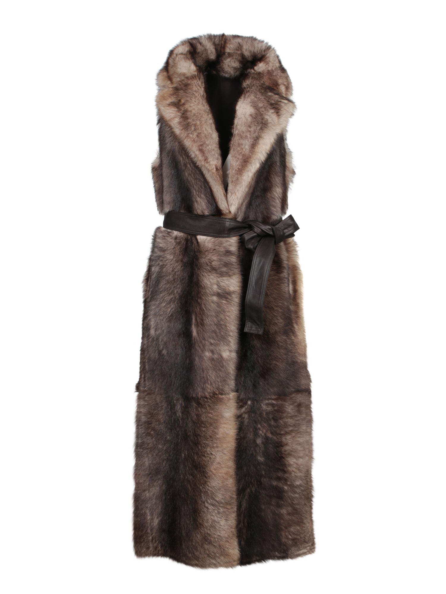 Long sheepskin fur vest. Wide and enveloping collar. Leather belt.