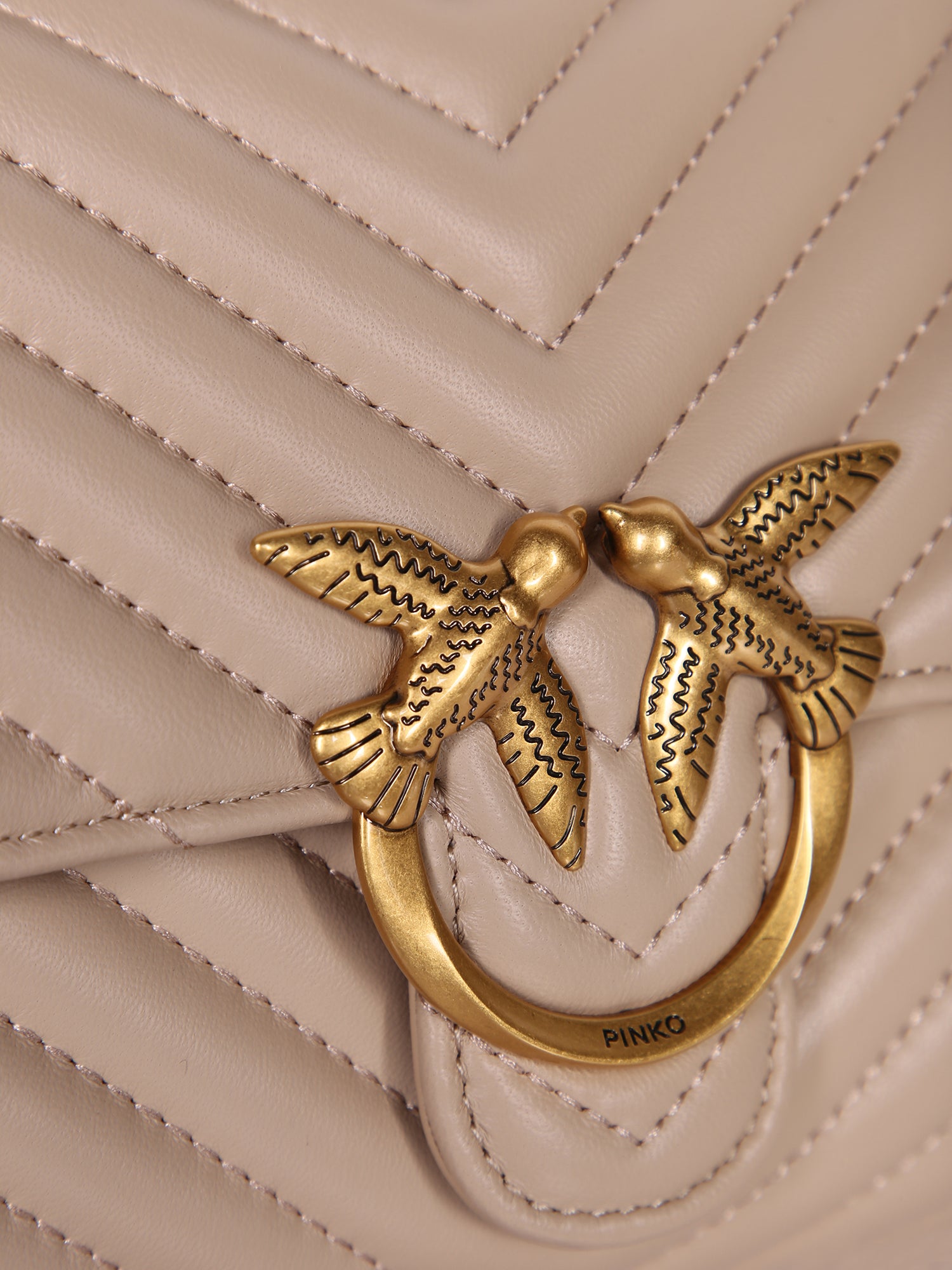 Quilted leather in Chevron pattern. Gold metal buckle detail. Flap closure.