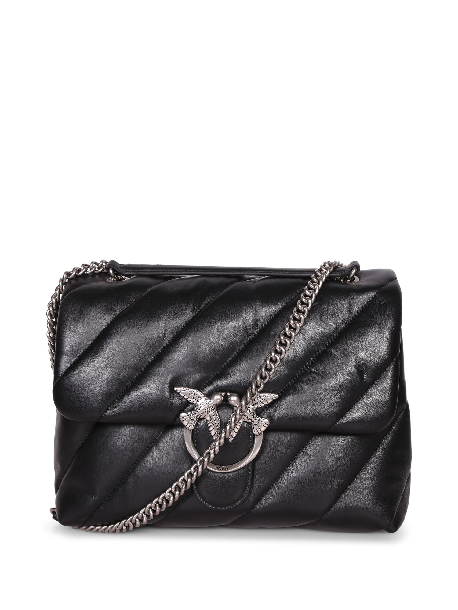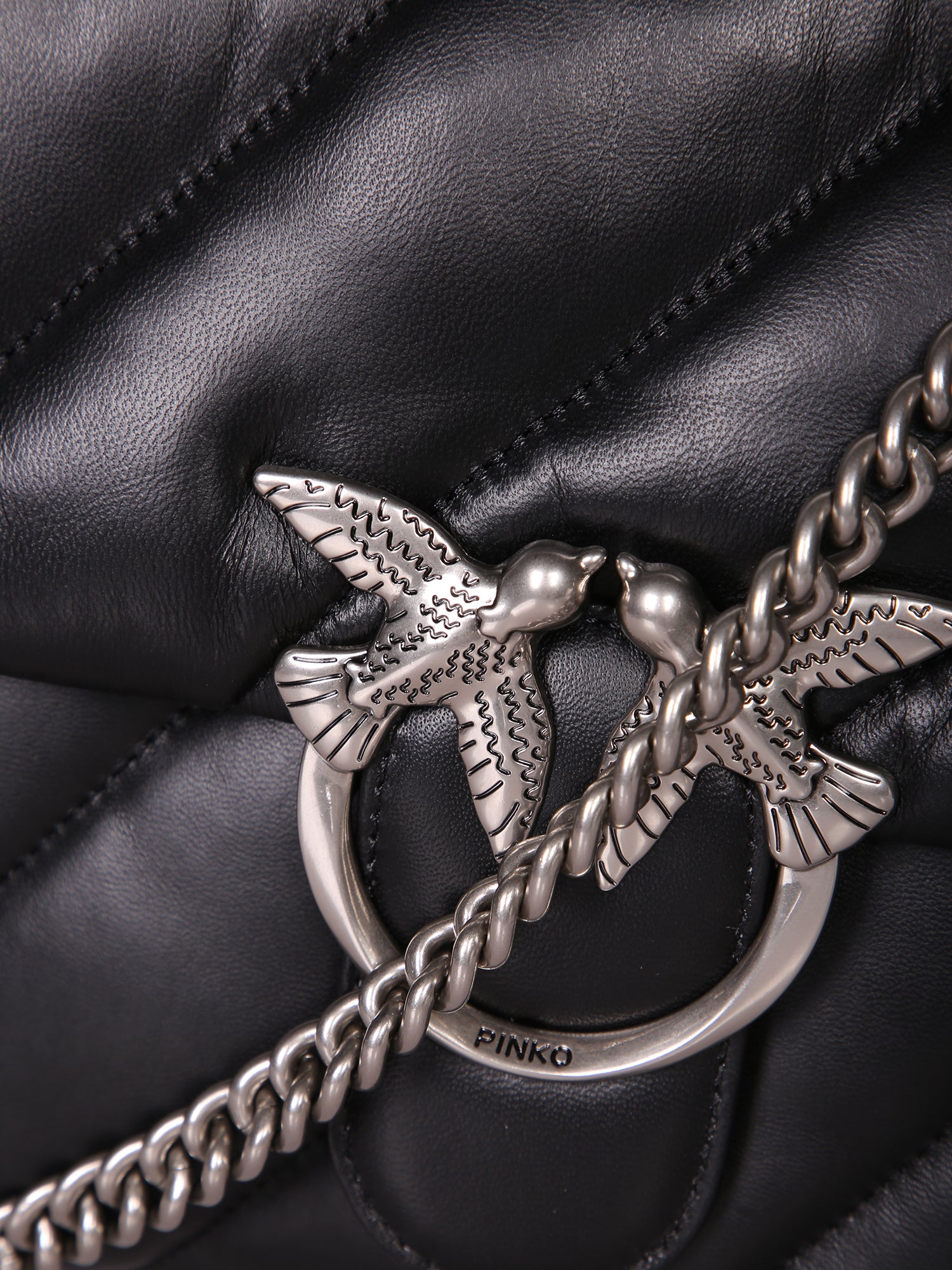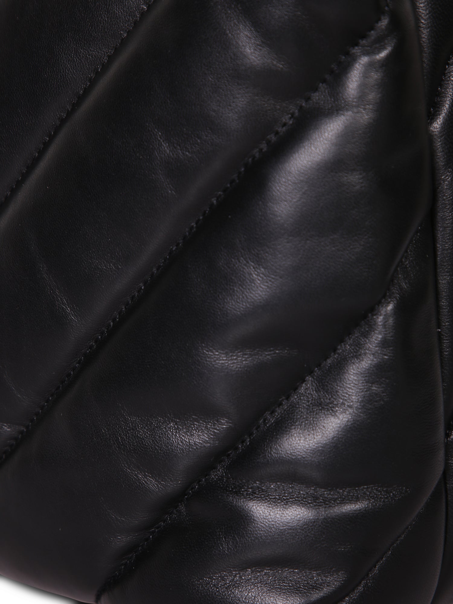 Soft leather. Diagonal quilted effect. Flap closure. Buckle detail with birds.