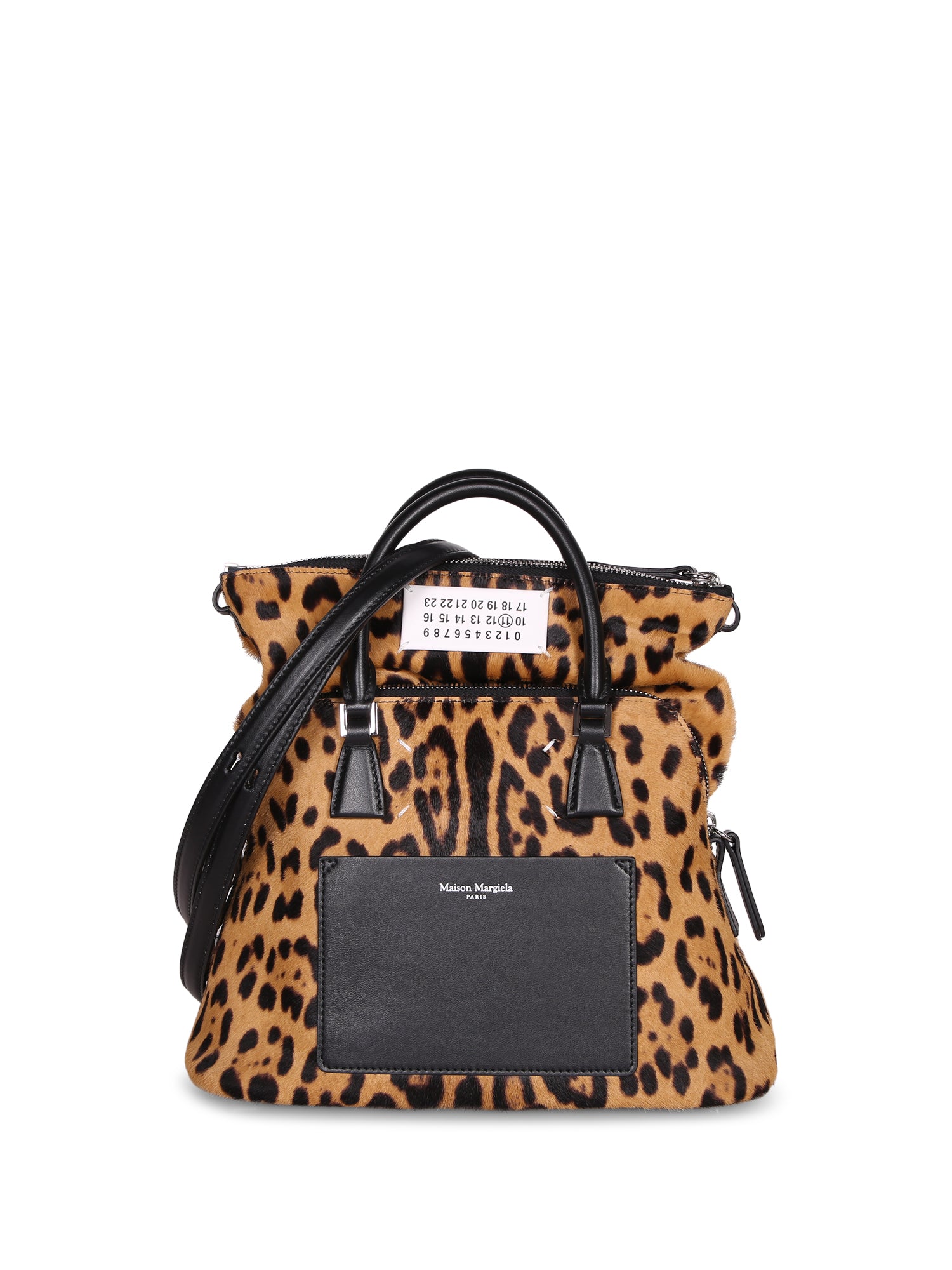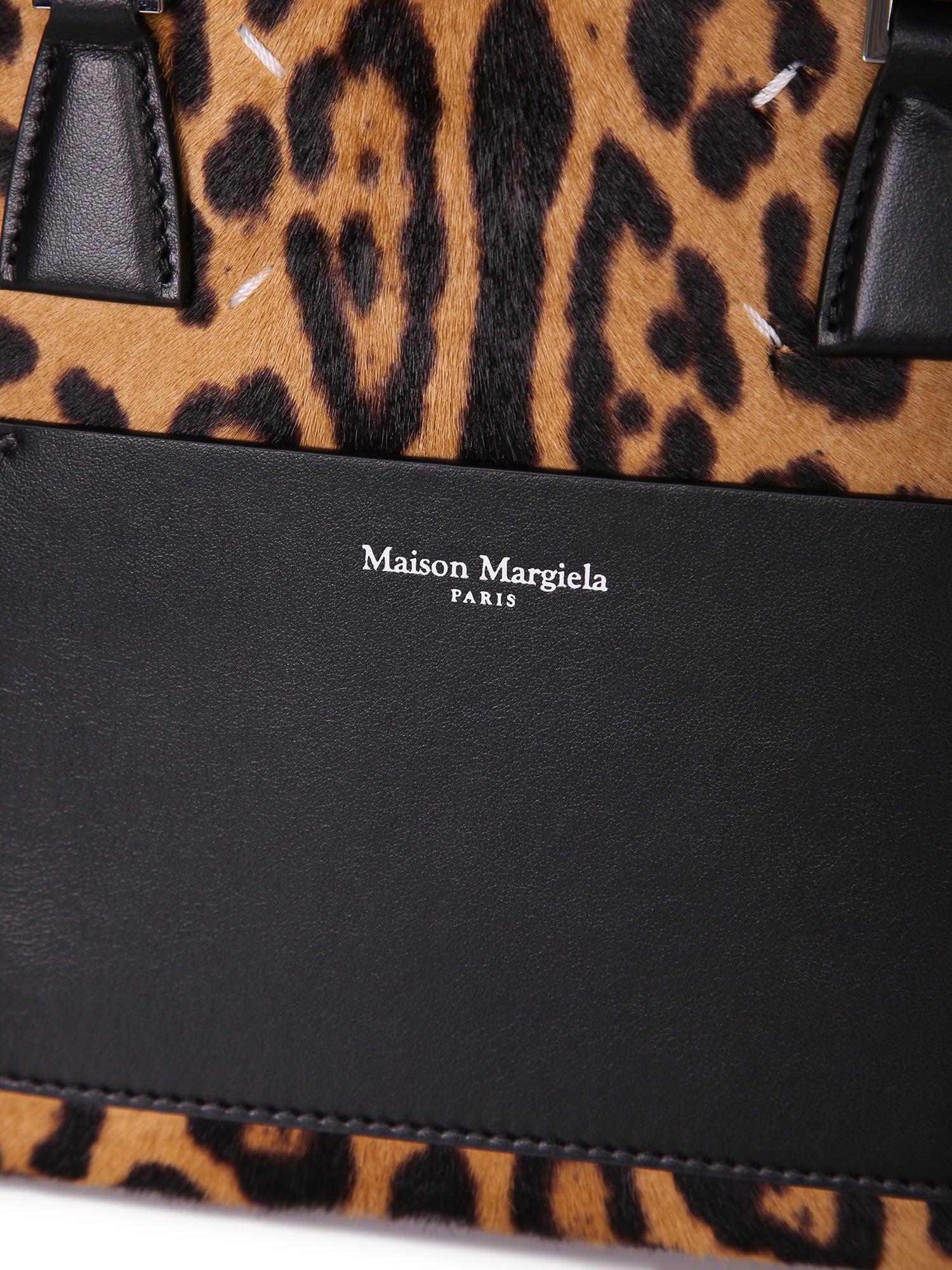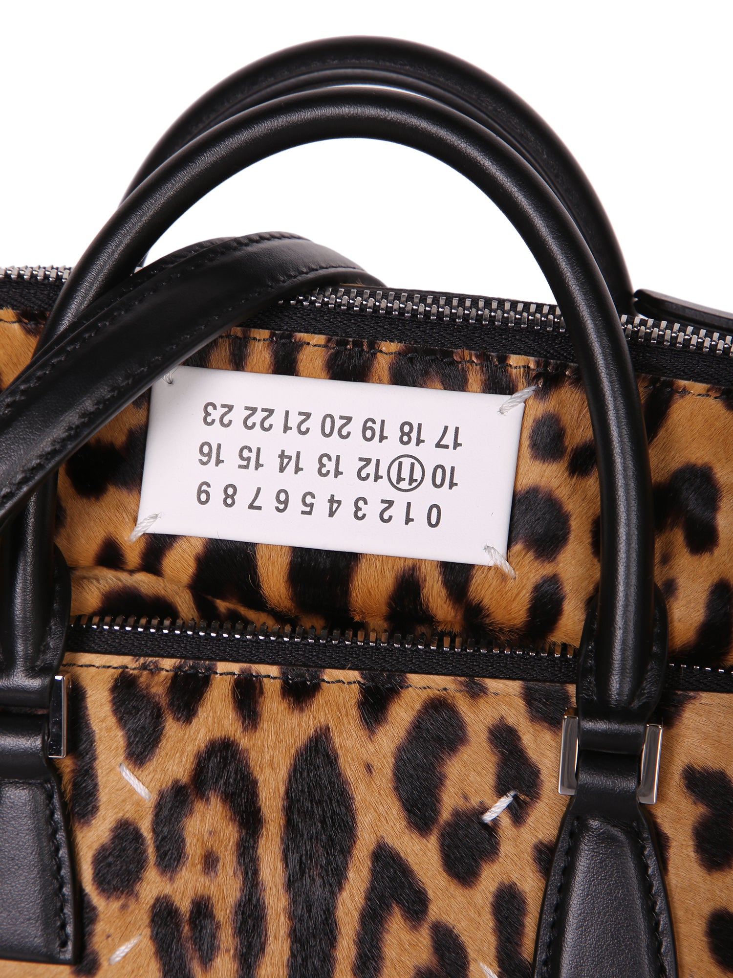 Faux fur bag with leopard print. Black leather details. Zippered top closure.