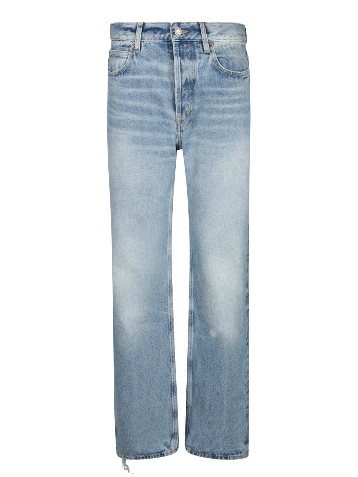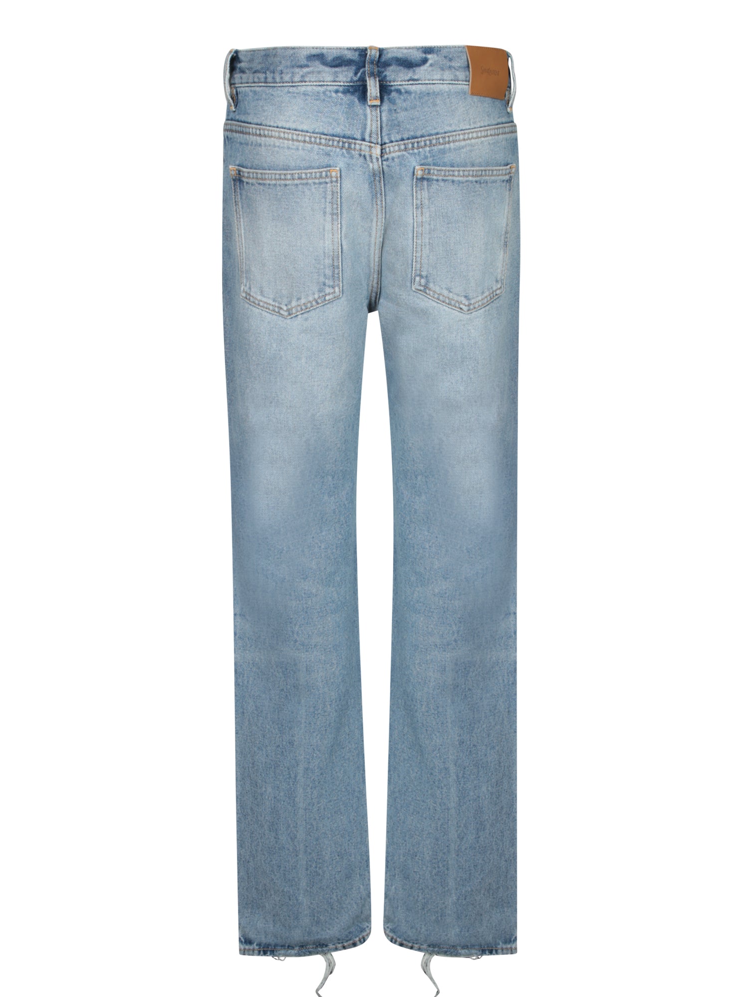 Low rise jeans with a straight cut. Classic five-pocket design. Distressed details and frayed hem.