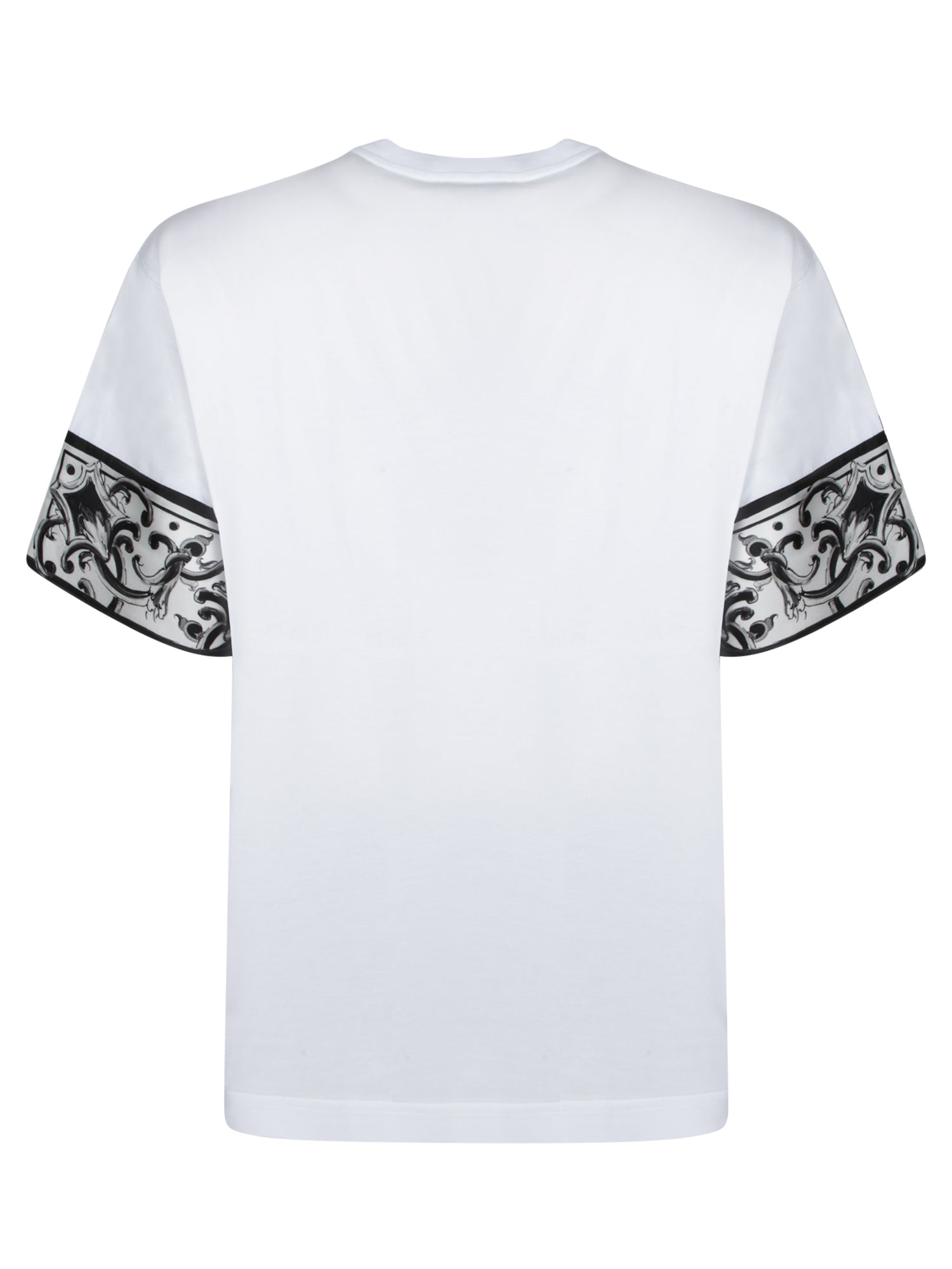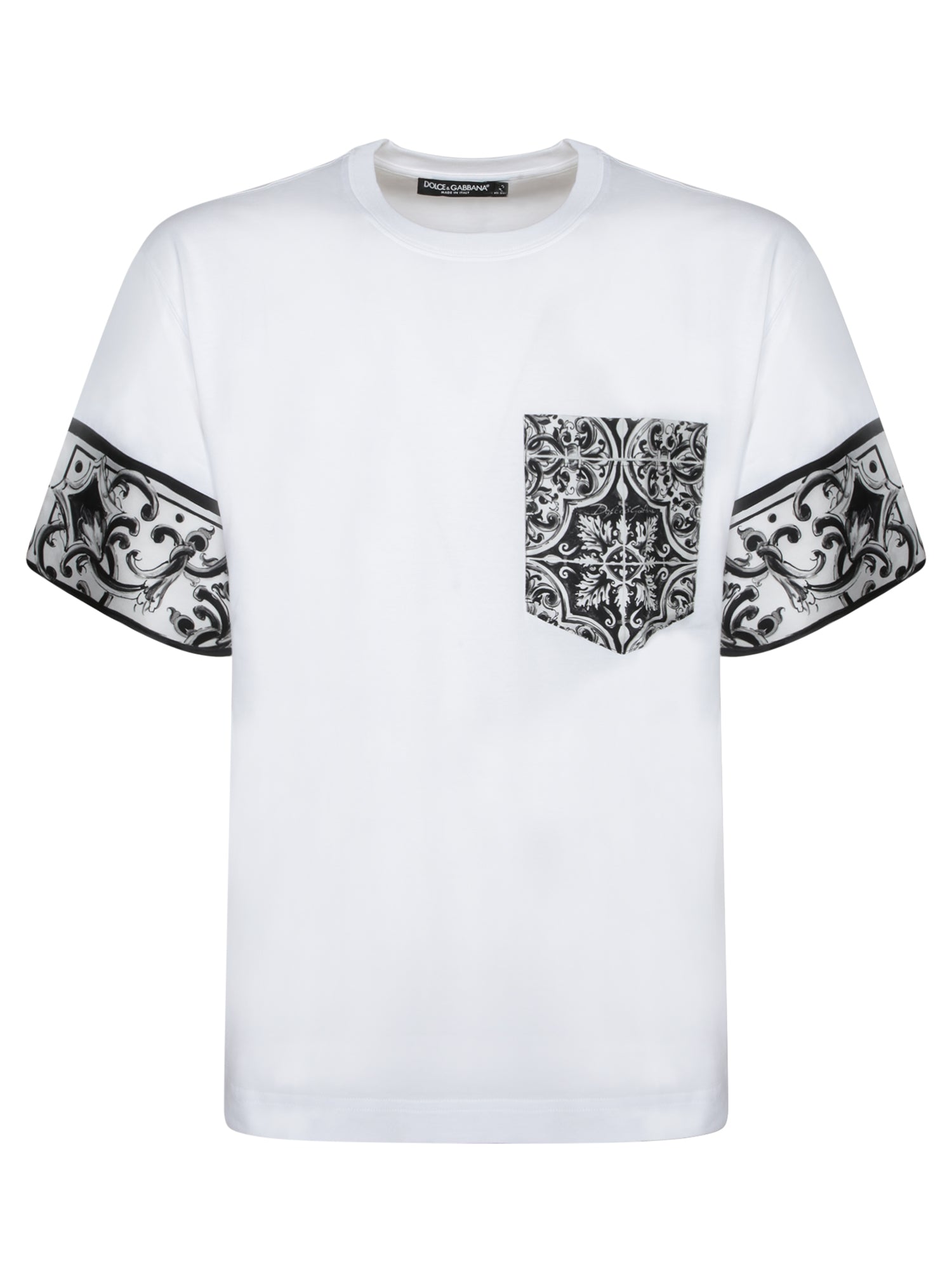A Dolce & Gabbana white t-shirt enhanced with an exquisite maiolica design. The ornamental pattern, inspired by traditional Italian ceramics, adorns the sleeves and a subtle front pocket, evoking a quiet yet distinctive elegance.