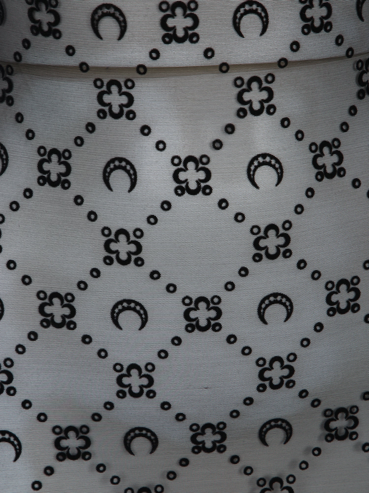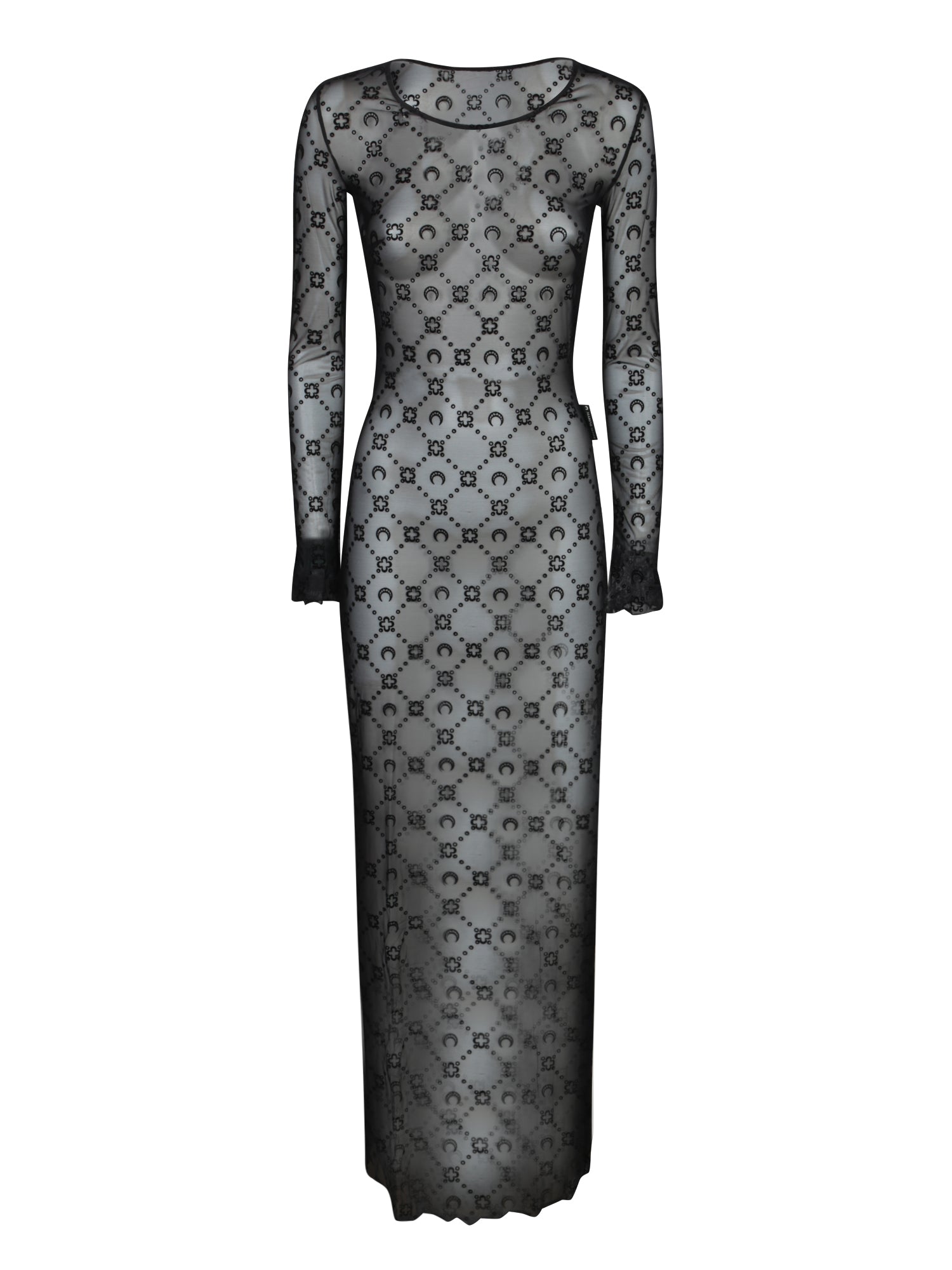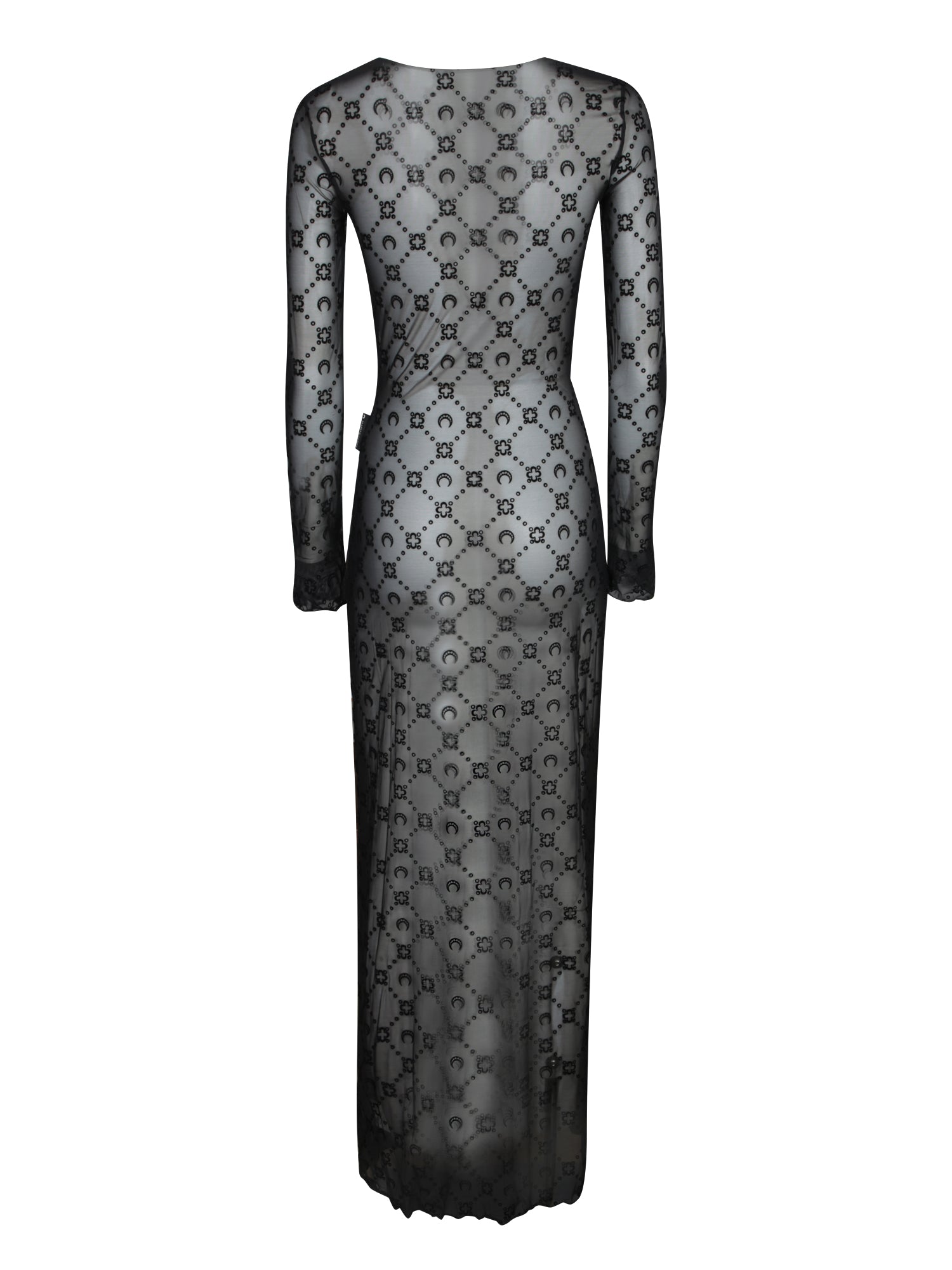 Long dress in transparent mesh with long sleeves. Features an all-over exclusive brand print.