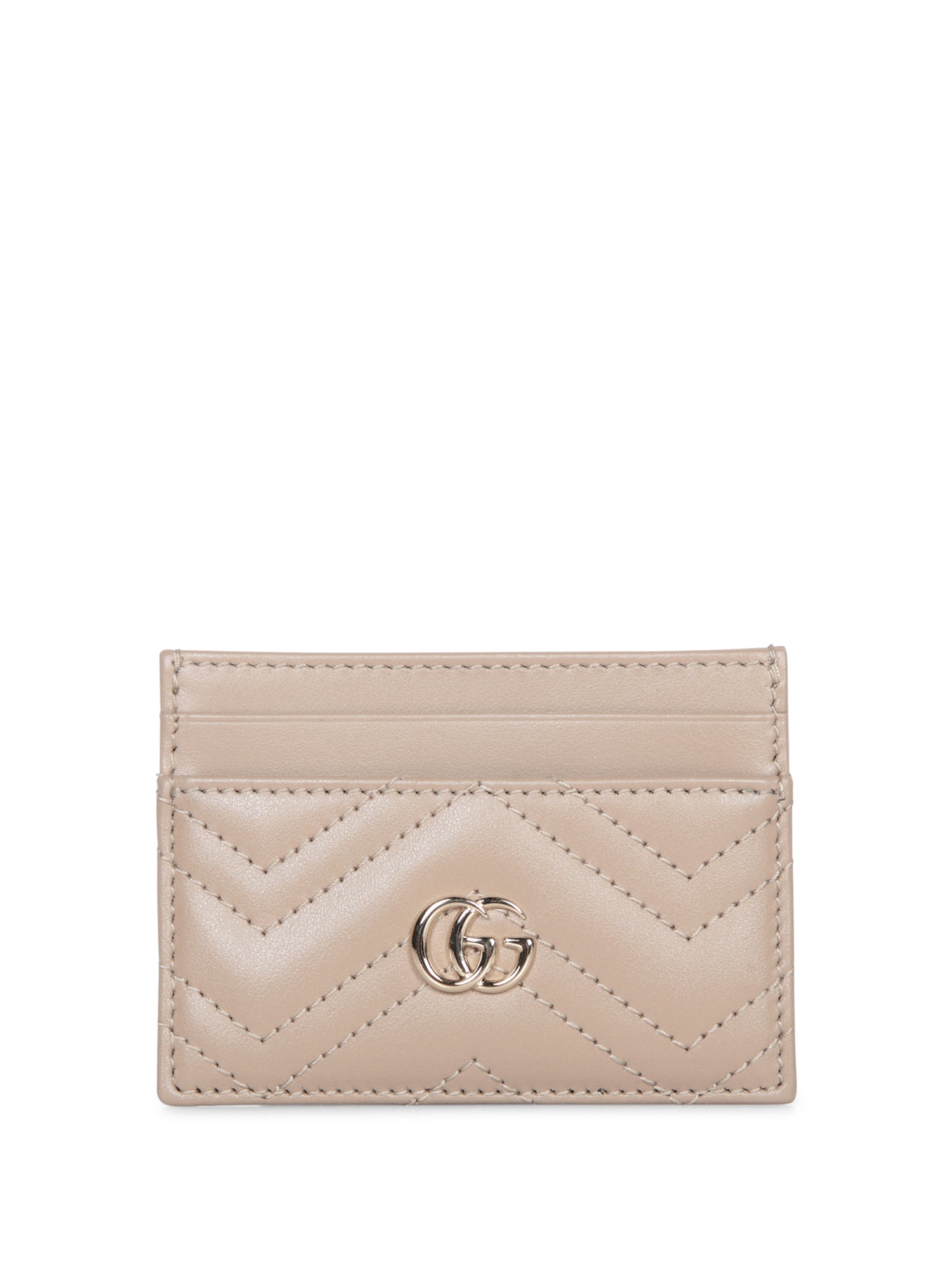 Chevron pattern design. Gold-toned GG metal logo. Multiple card compartments.