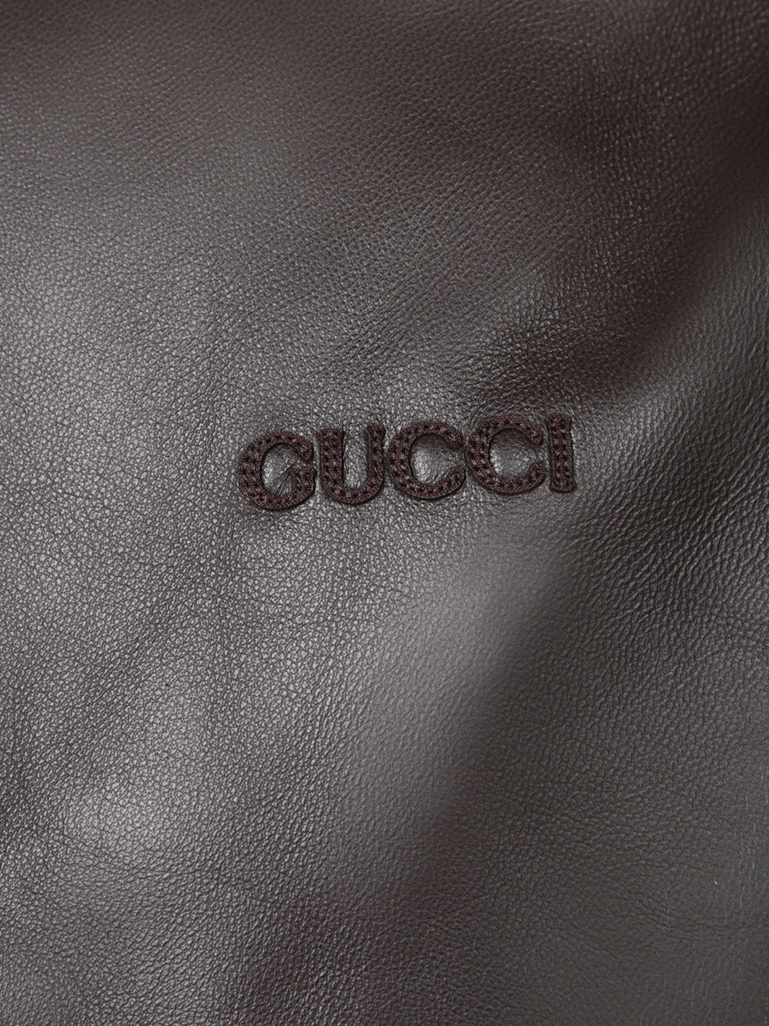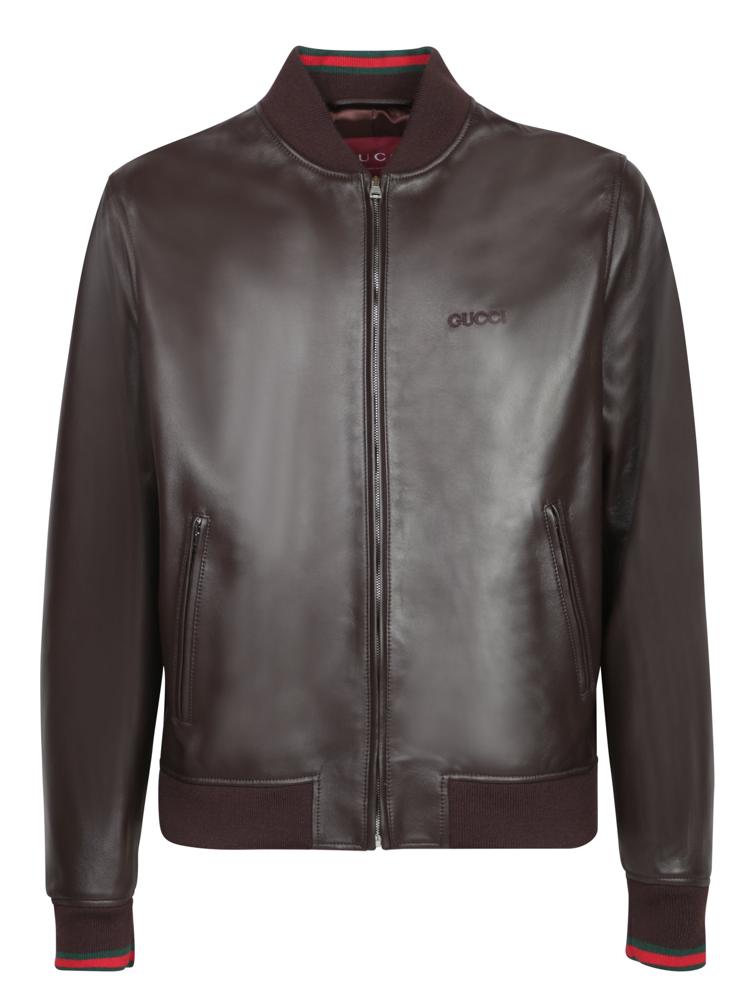 Brown leather bomber. Ribbed collar, cuffs, and hem. Front zip closure.