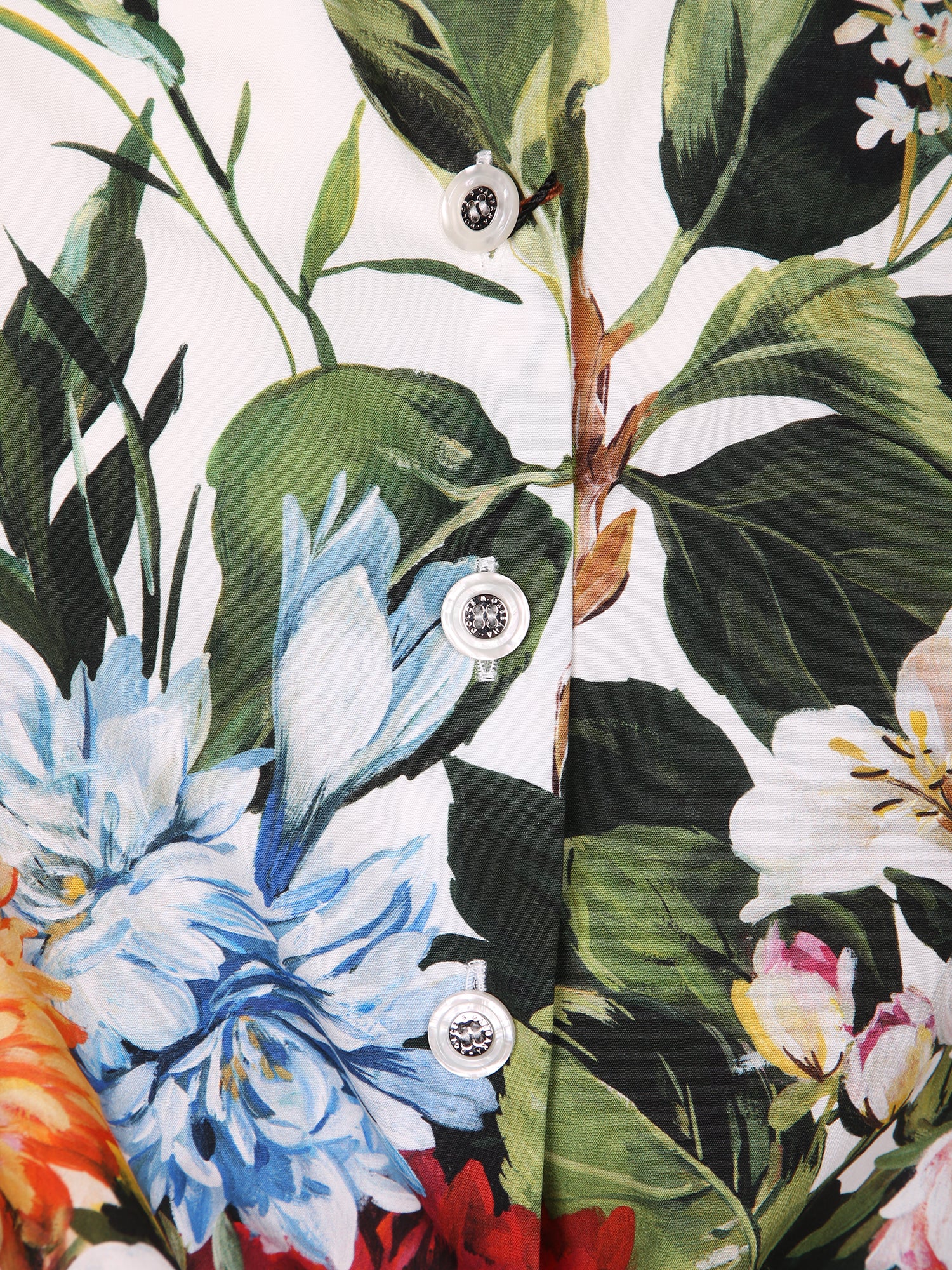 Long sleeve crop shirt, smooth fabric with vivid floral print. Front button closure and decorative bow at the waist.