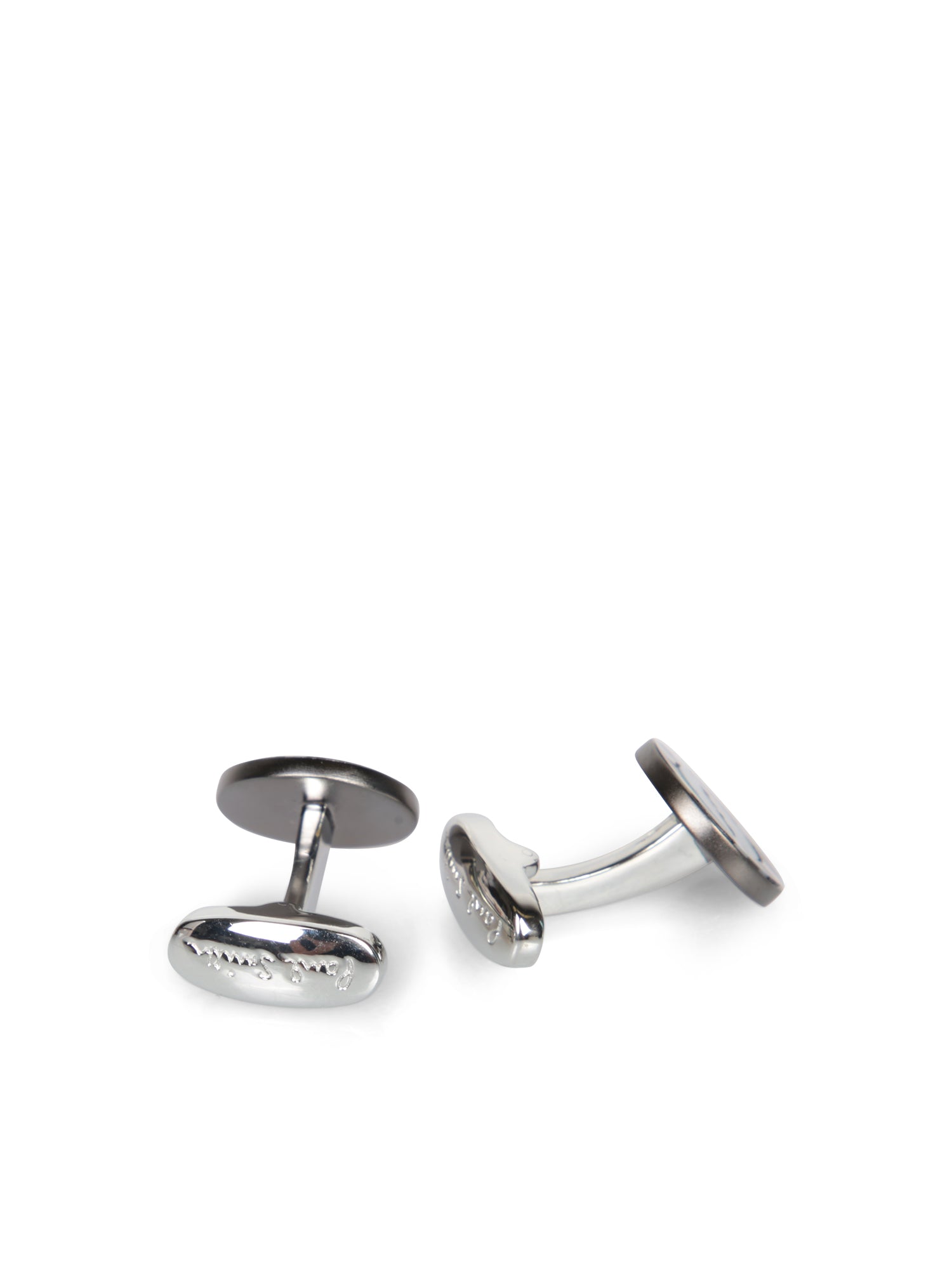 Circular cufflinks featuring striped edges and a central logo.