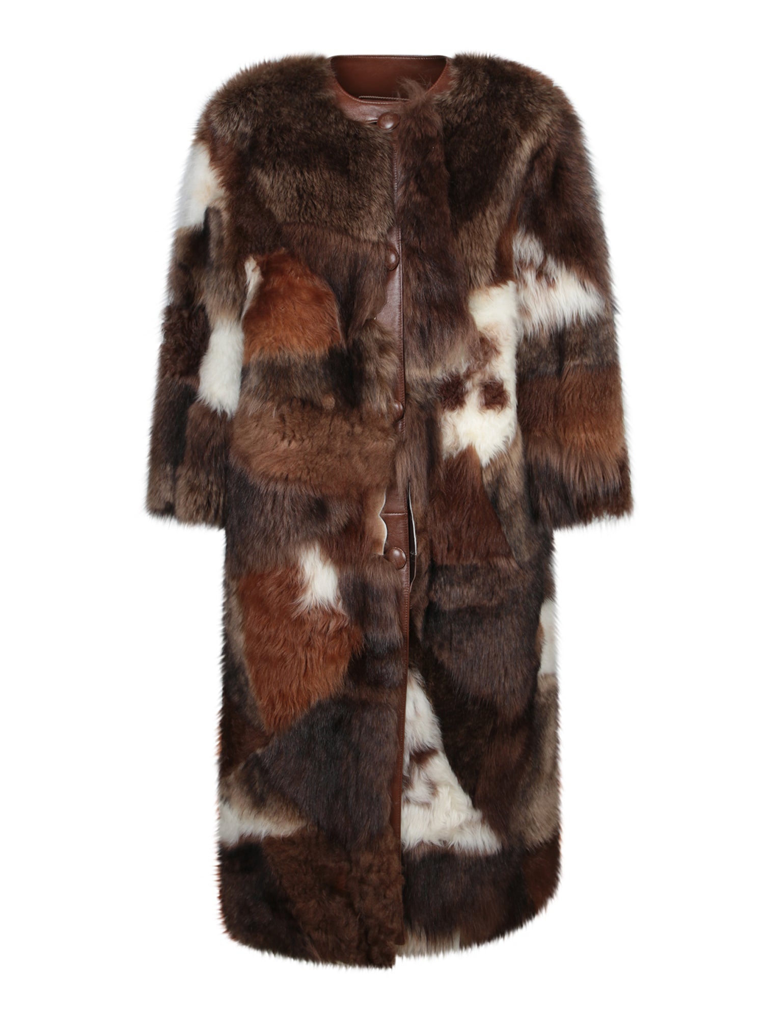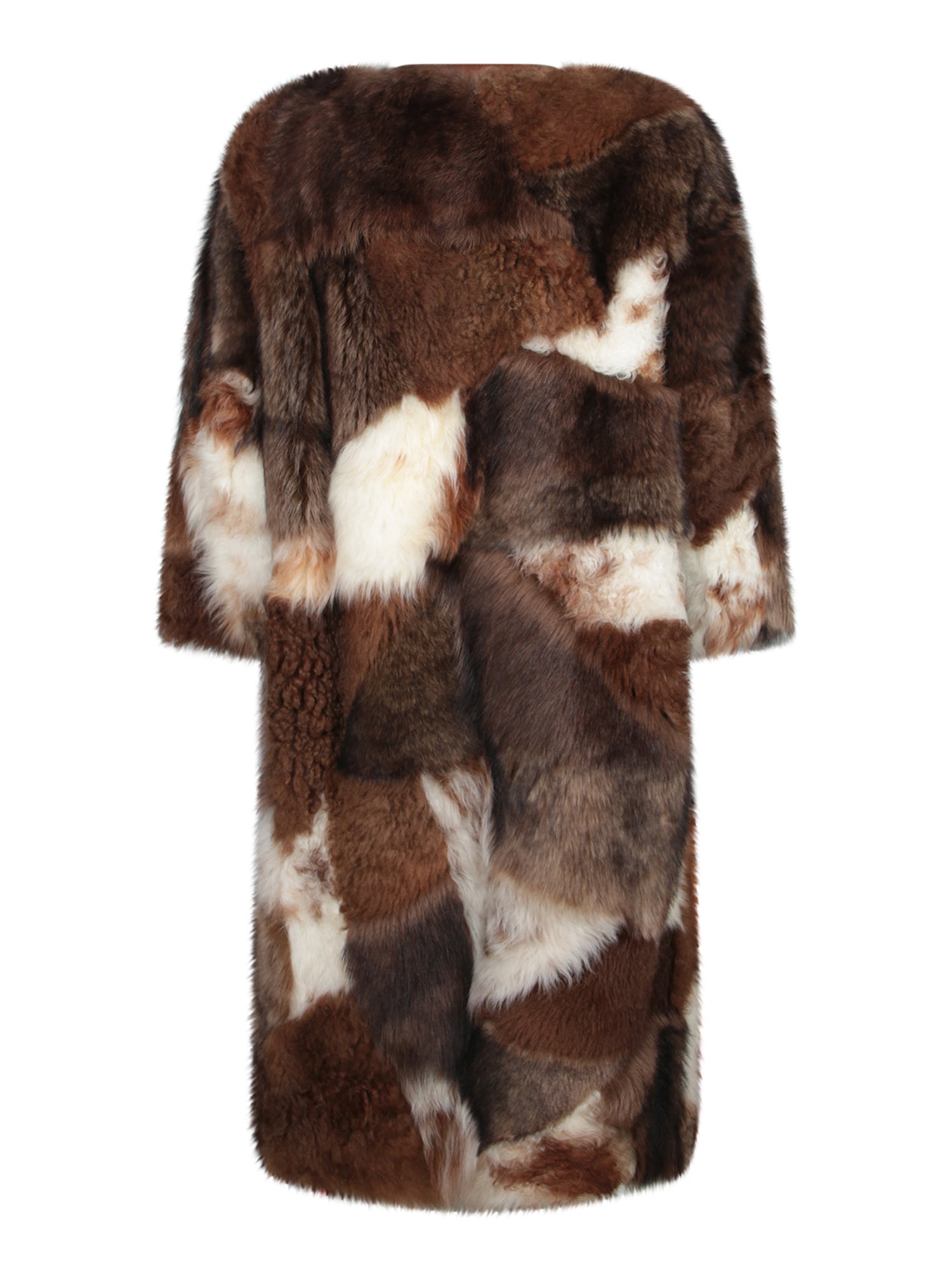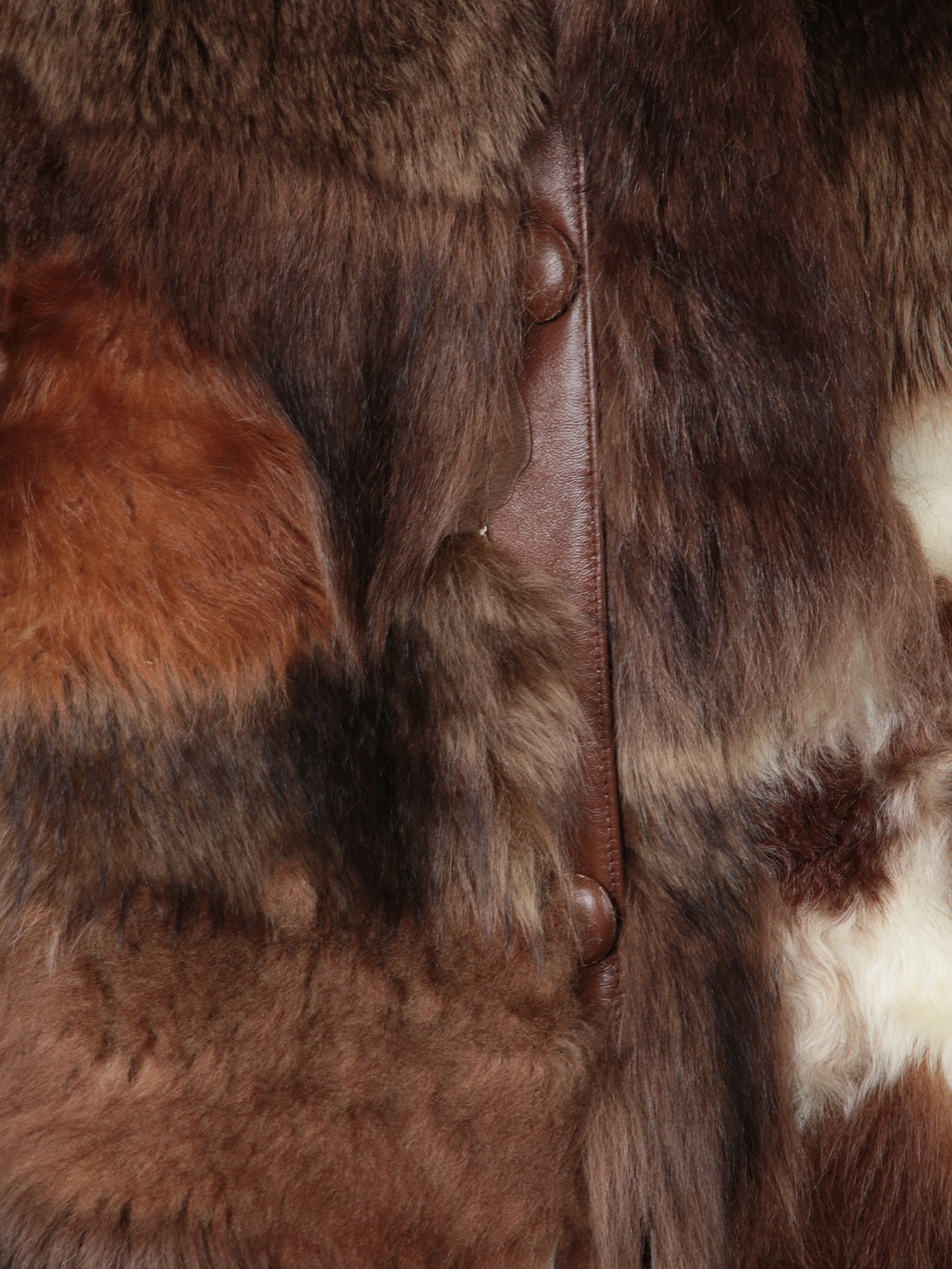 Sheepskin coat with a multicolor patchwork. Front button closure. High collar.