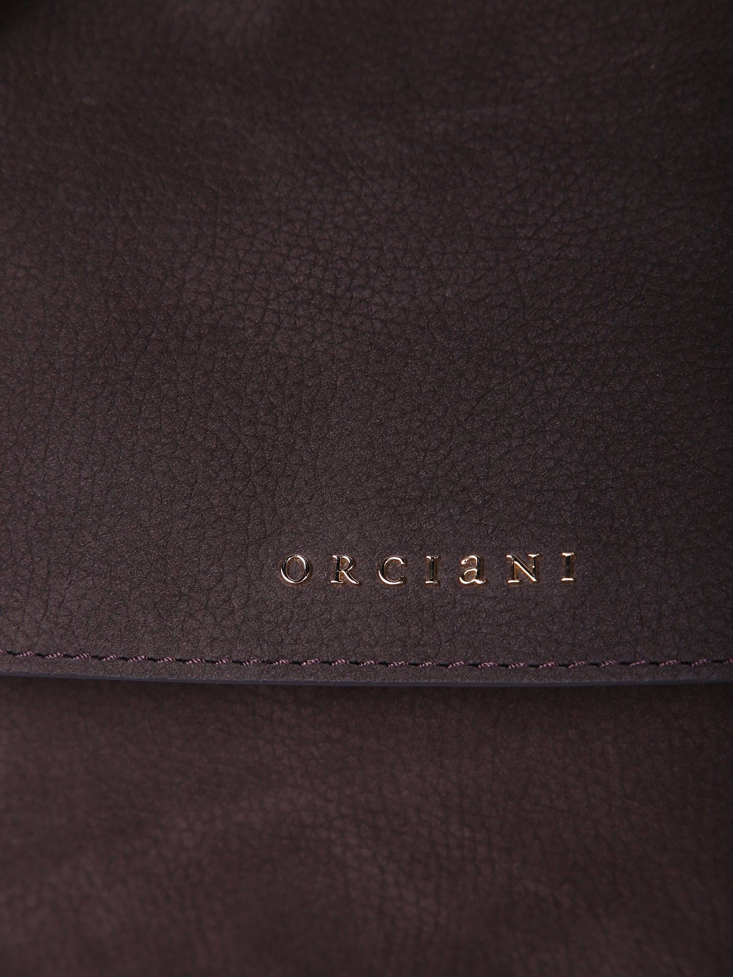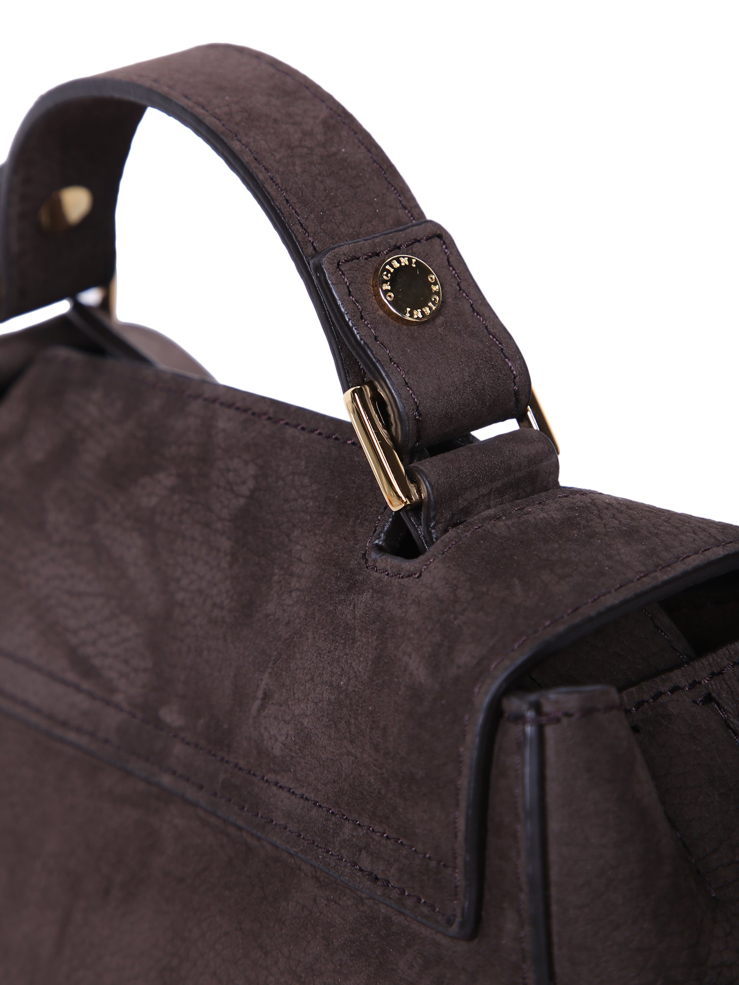 Brown suede leather bag. Top handle and adjustable, detachable shoulder strap. Front flap closure.