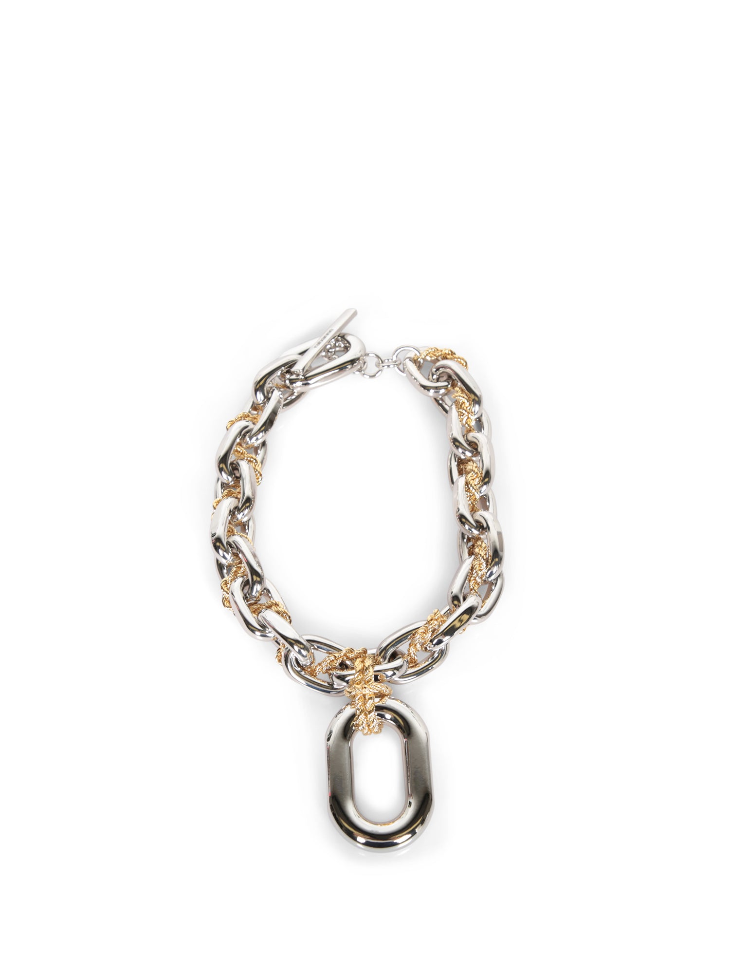 This exquisite Paco Rabanne necklace features a sophisticated blend of silver links enhanced with intricate gold details, secured with an elegant lobster clasp closure.