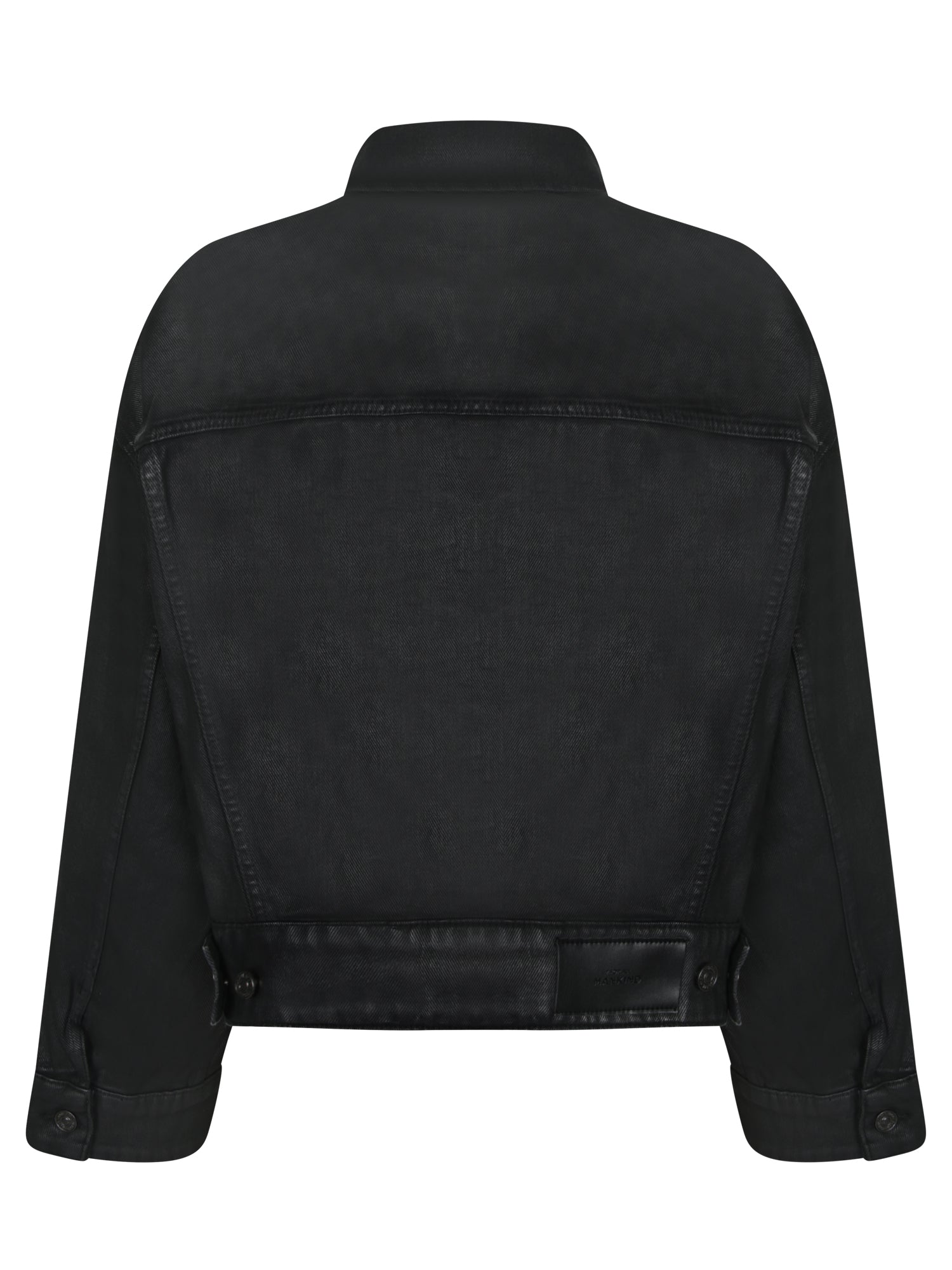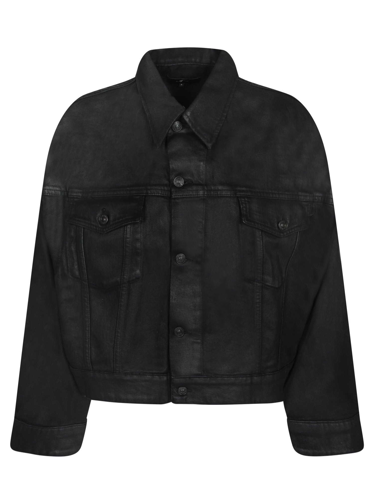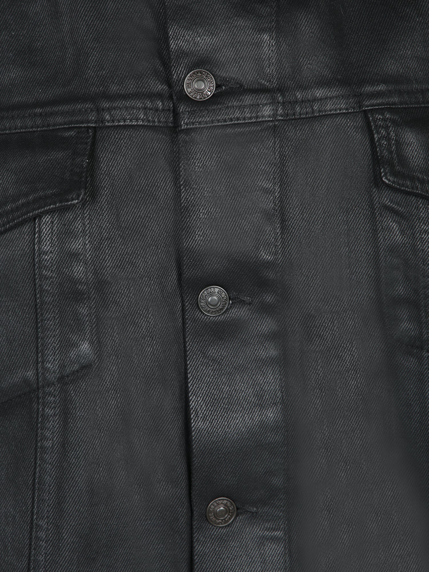 Short coated fabric jacket. Classic collar, button closure, flap pockets. Long sleeves with buttoned cuffs.
