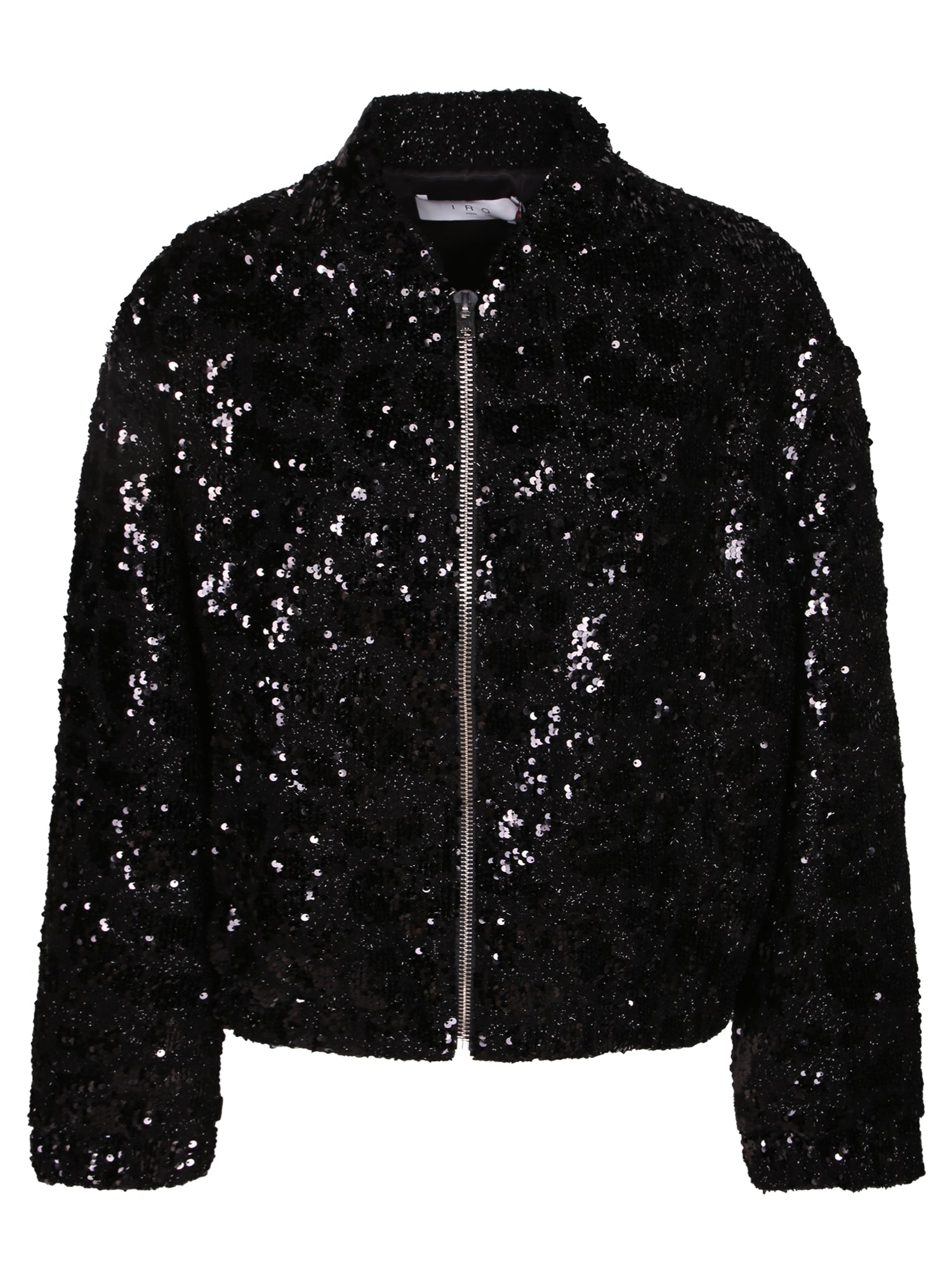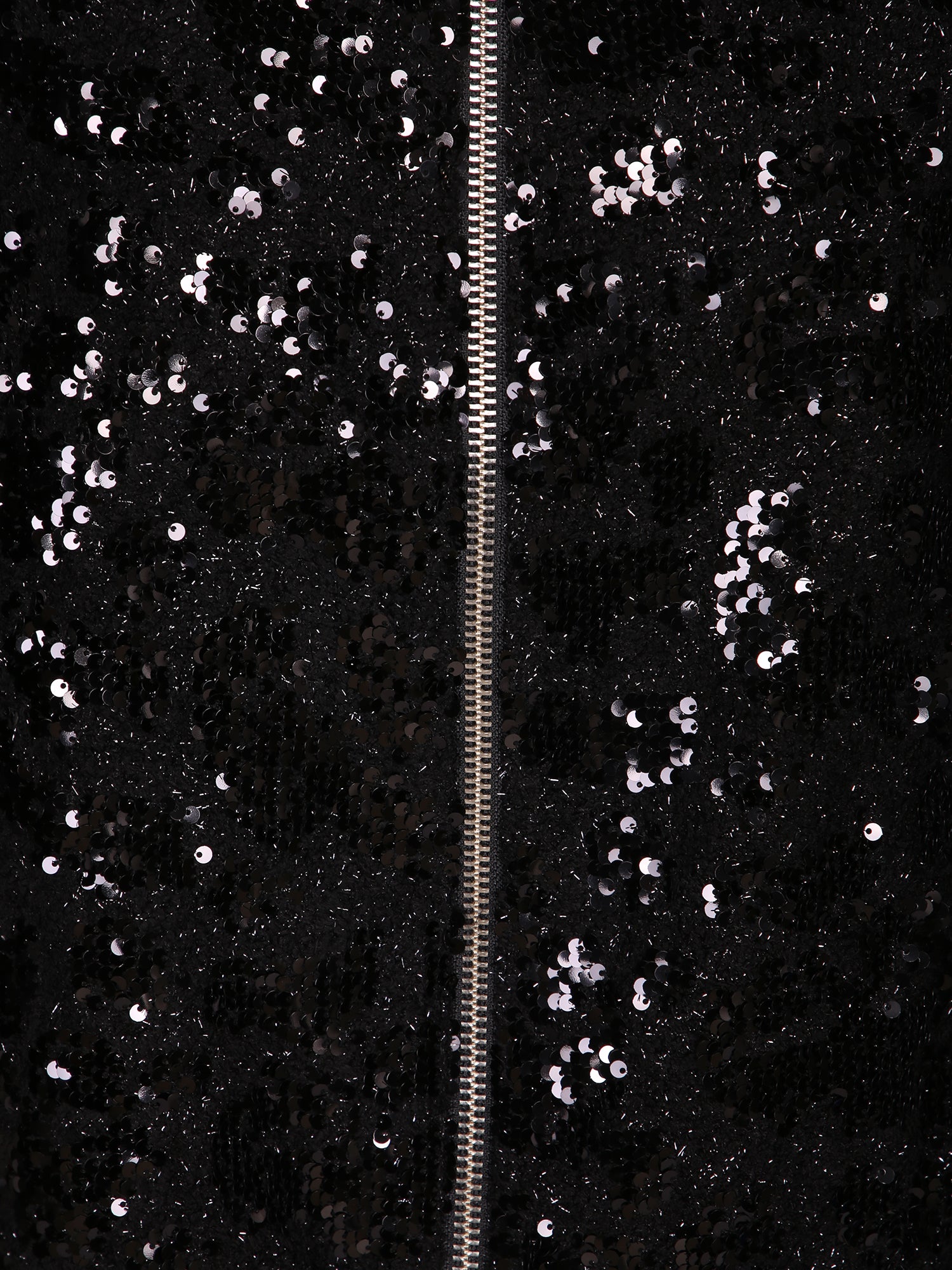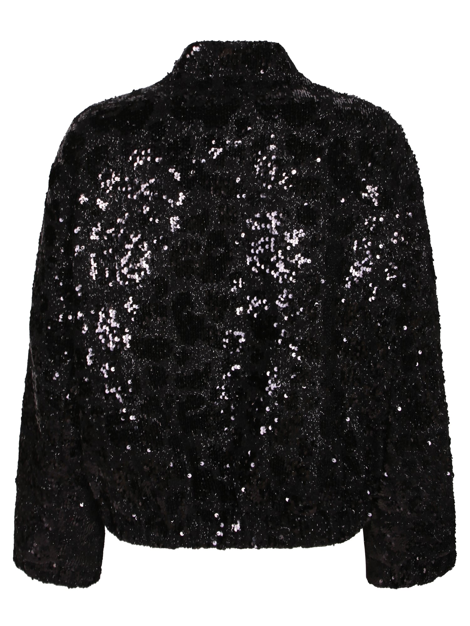 Black sequined bomber jacket. Front zip closure. Ribbed collar, cuffs, and hem.