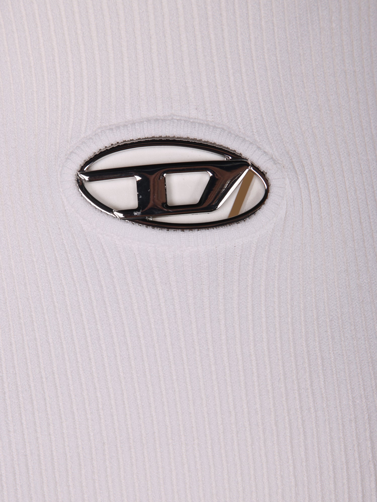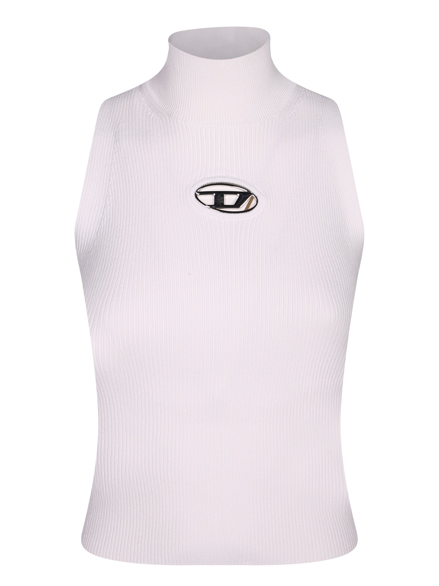 High neck, sleeveless, ribbed fabric with applied metallic logo.