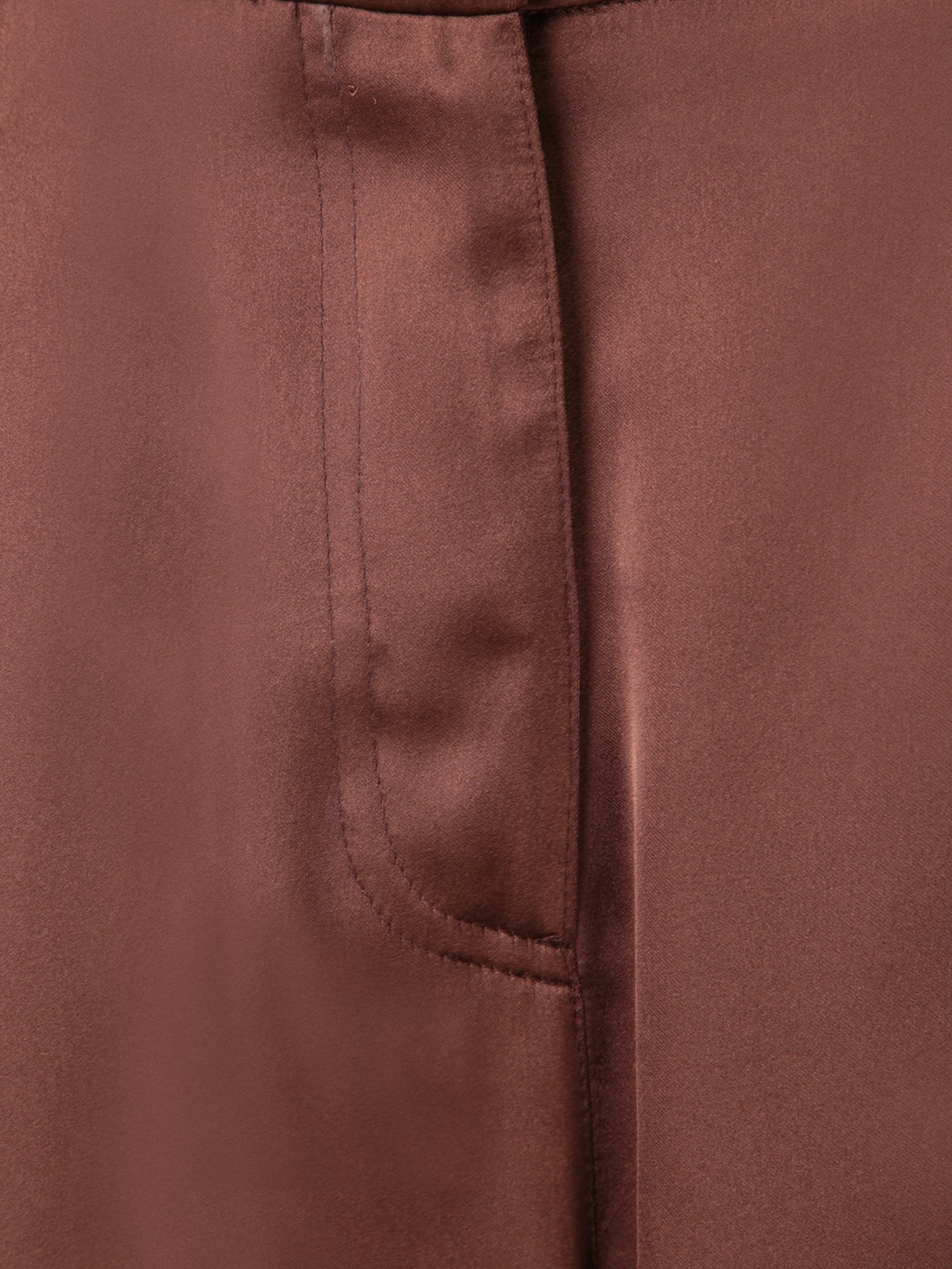 Regular waist. Belt loops. Front button and zip fastening. Satin finish. Two side slash pockets. Two rear patch pockets. Color: brown