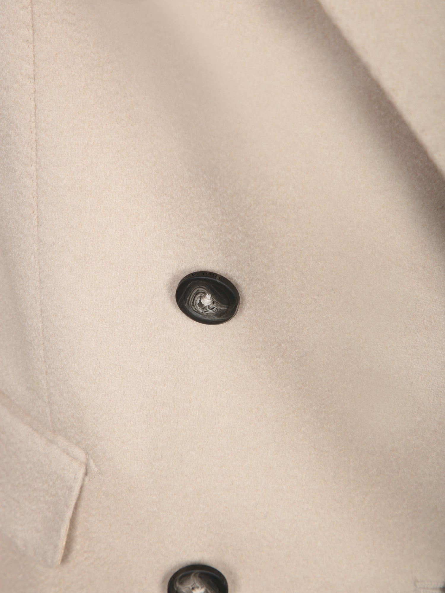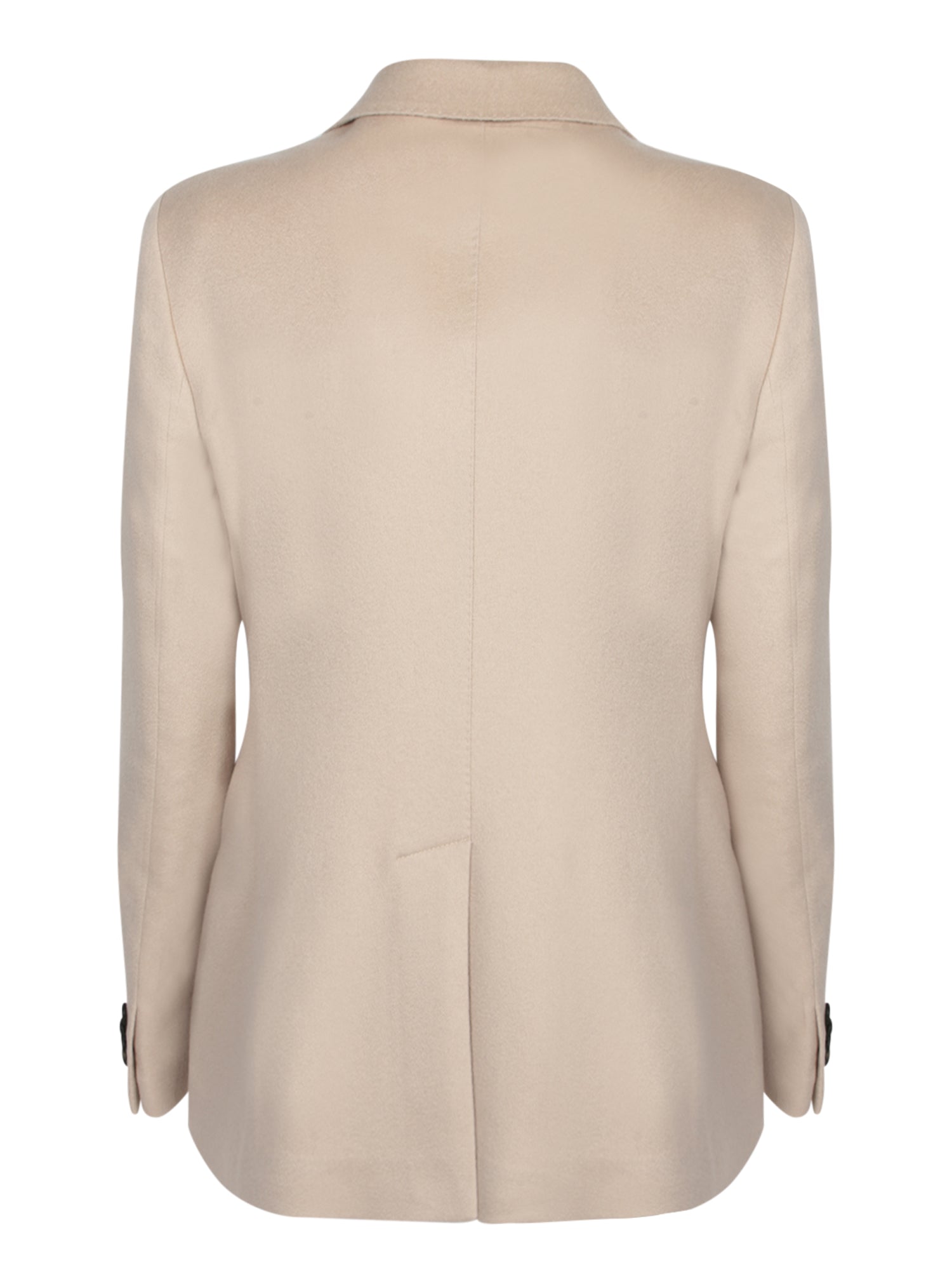 Double-breasted jacket. Notched lapel. Long sleeves. Flap pockets. Internal lining.