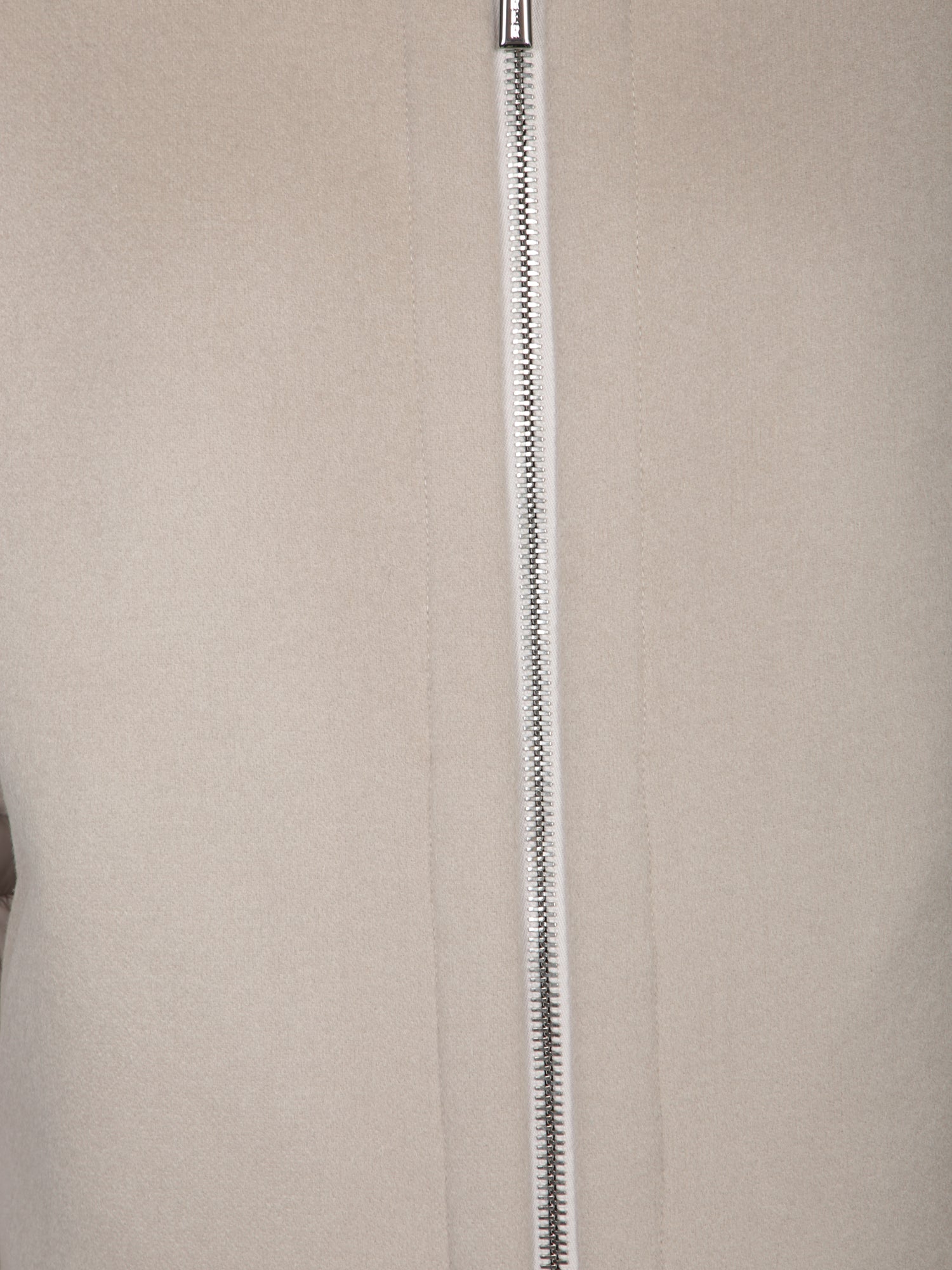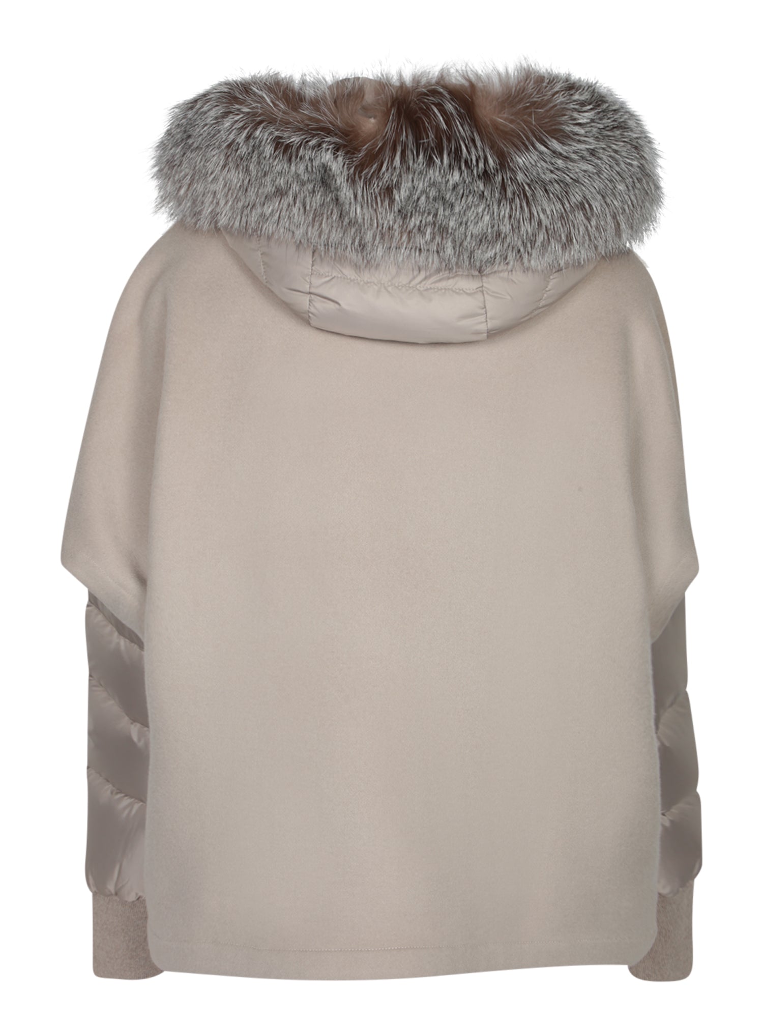 Wool cape with nylon inserts. High collar and hood with fur. Front zip closure.