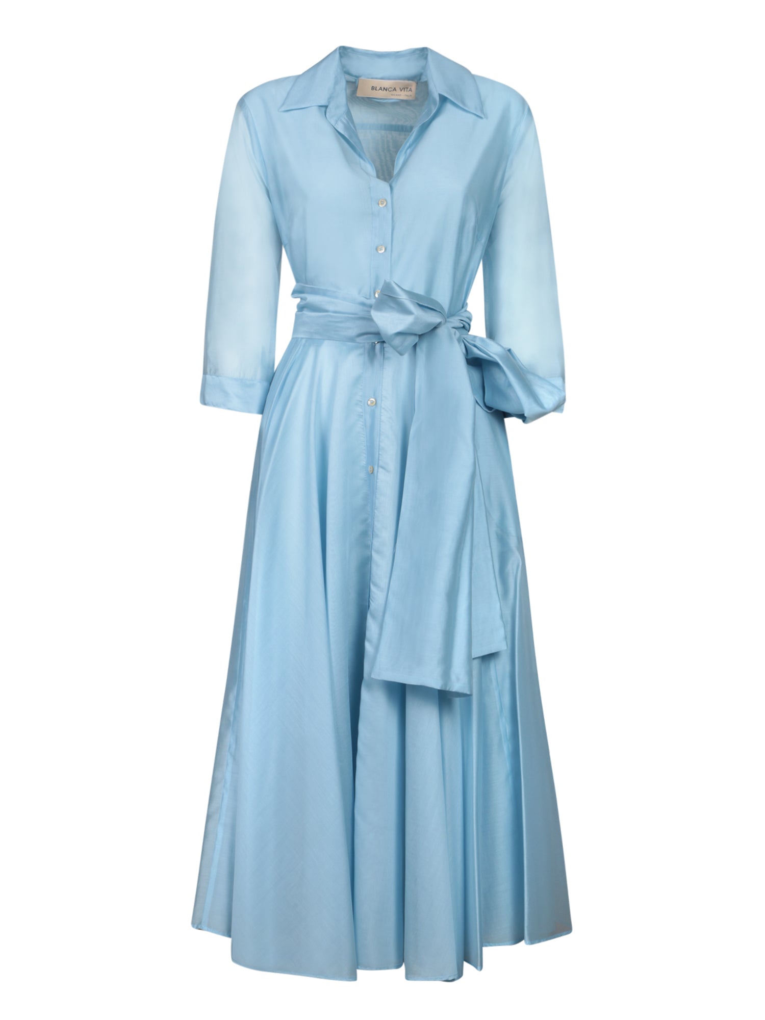 Three-quarter sleeves. Shirt collar. Front button closure. Matching belt.